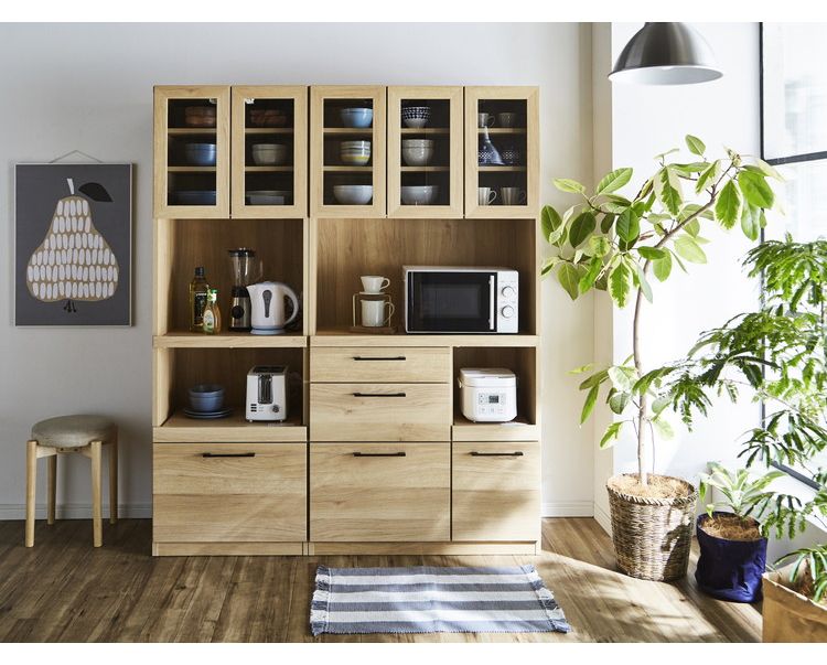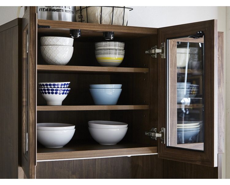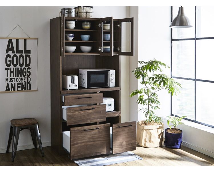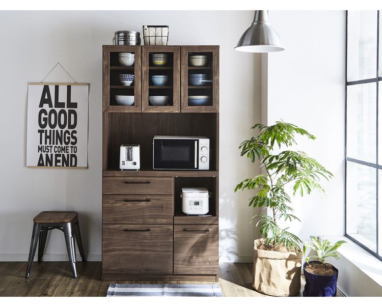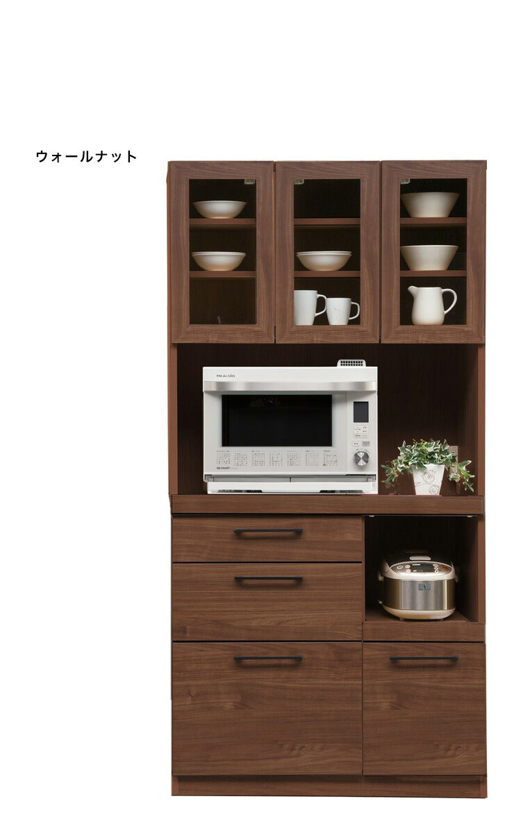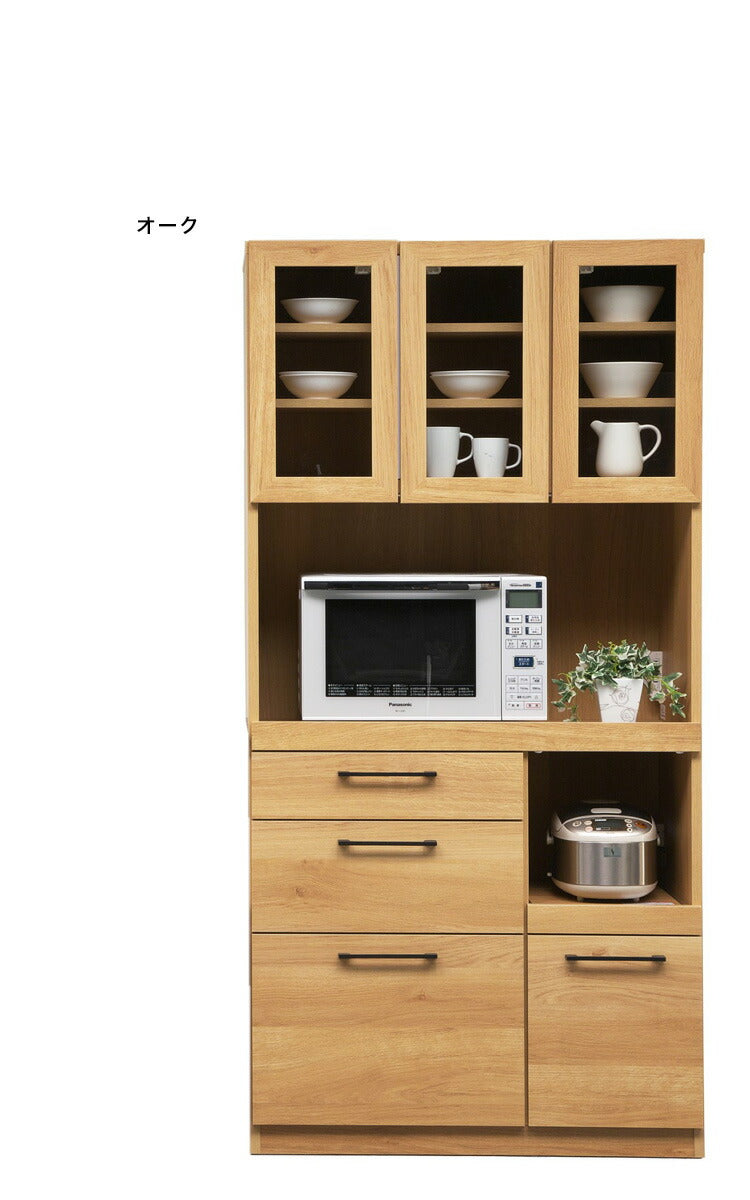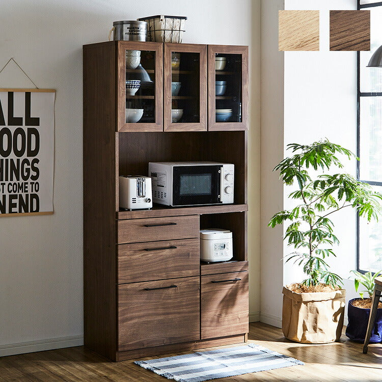 食器棚 キッチンボード 幅90 奥行45 高さ180 モイス加工付き 完成品 オーク ウォールナット ソフトクローズ レンジ台 ガラス扉(代引不可)