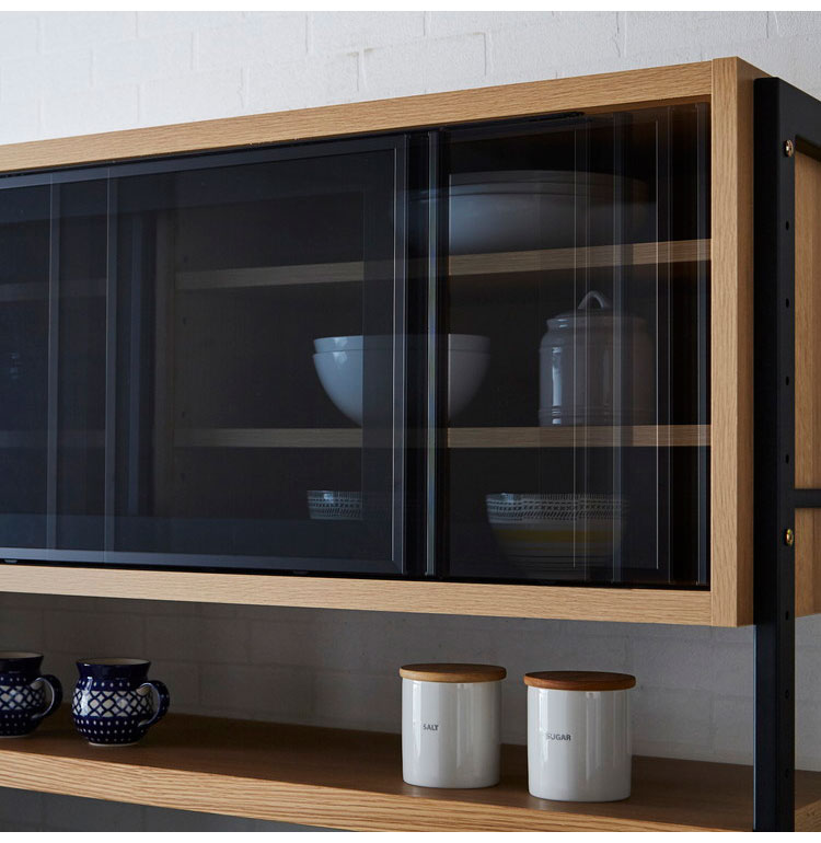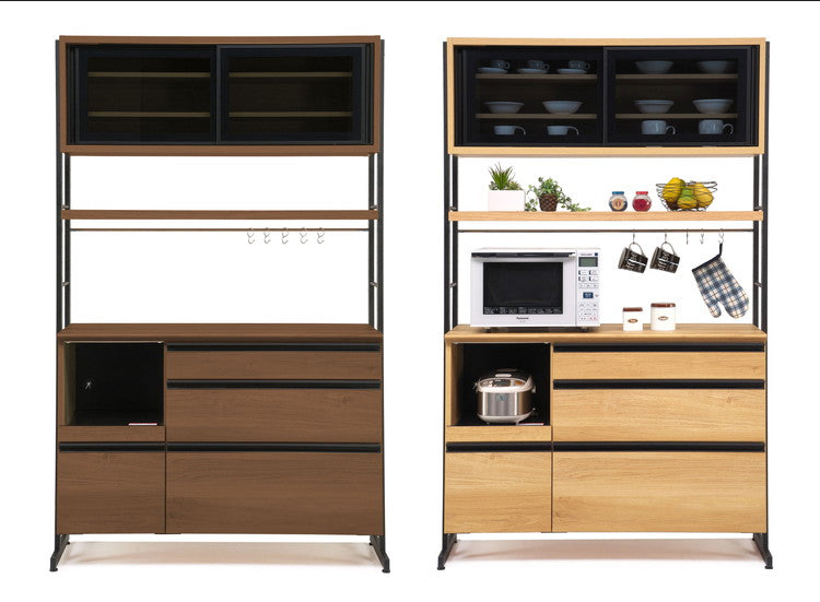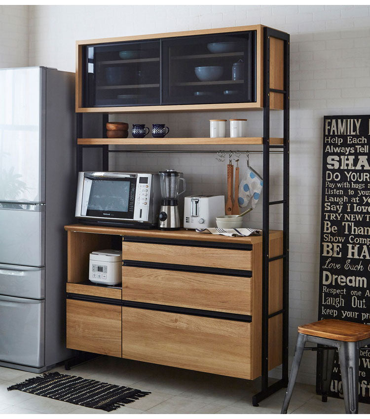 食器棚 キッチンボード 幅124 奥行48 高さ196 木目 開き戸 国産 高さ調節 おしゃれ アイアン モイス加工 レンジ台 レンジボード 大容量 キッチン 収納 ウォールナット オーク(代引不可)