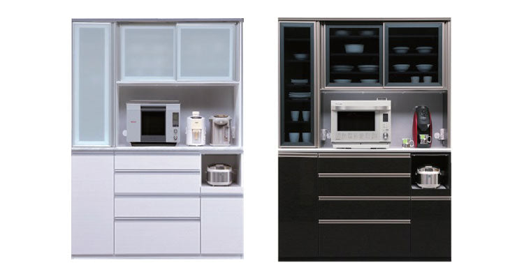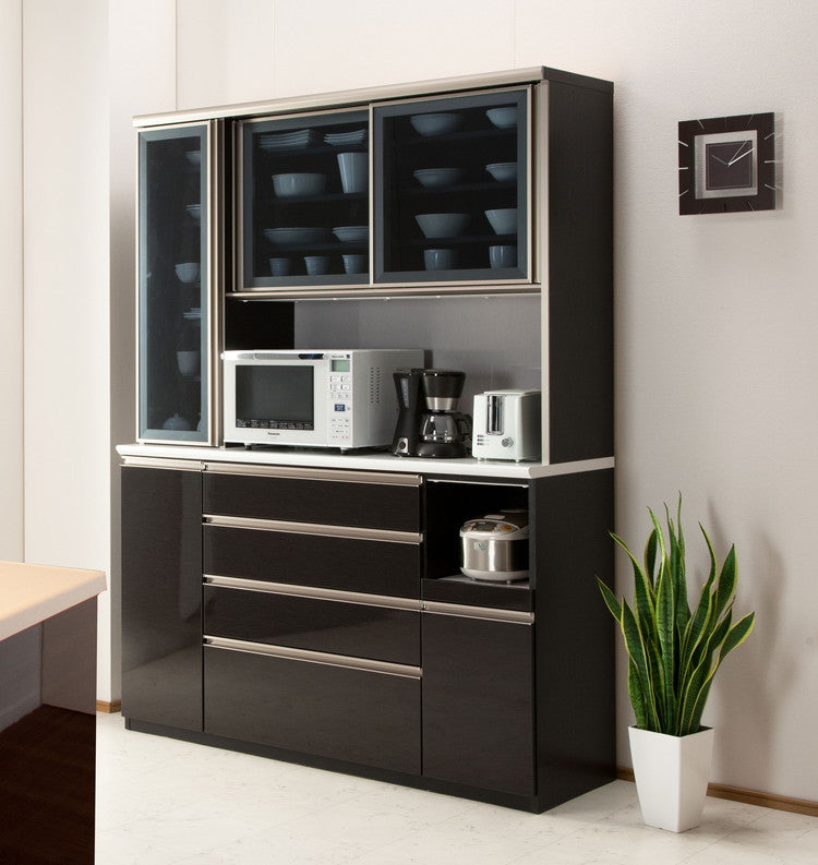 食器棚 キッチンボード 幅150 奥行48 高さ201.5 完成品 国産 モイス加工 レンジ台 レンジボード 大容量 ソフトクローズ キッチン 収納 木目 フルオープンレール ホワイト 白 ブラック(代引不可)