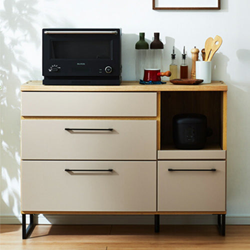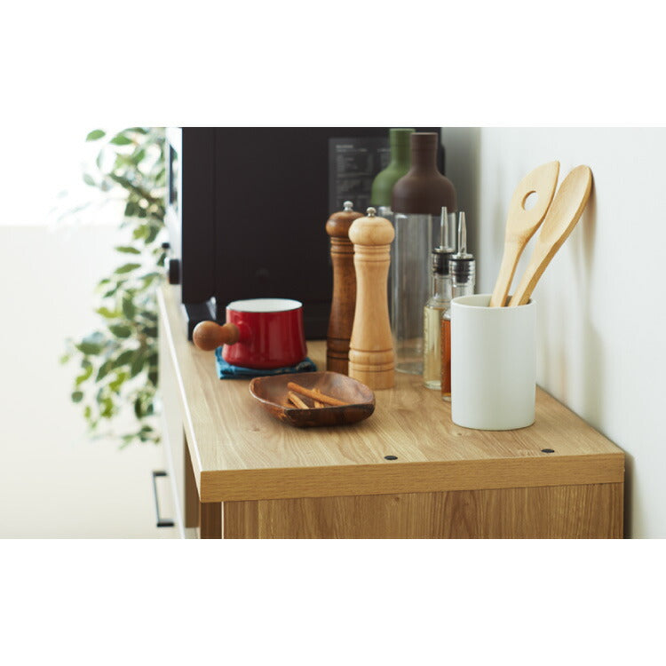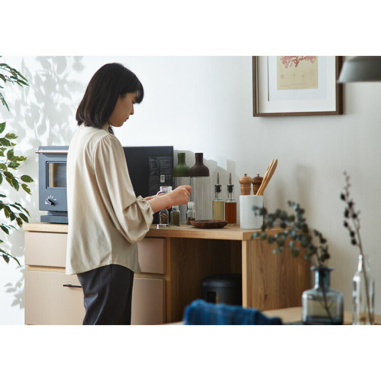 使う人に合わせてキャビネットの棚板部分を高さ調整することができます。大型のレンジも設置できます。