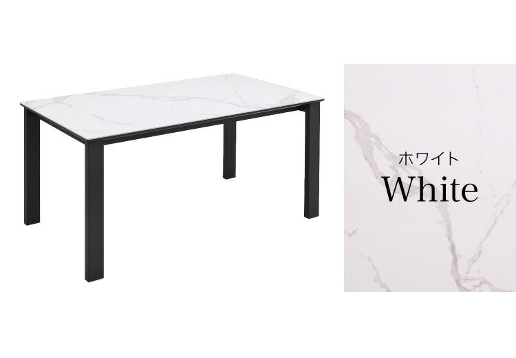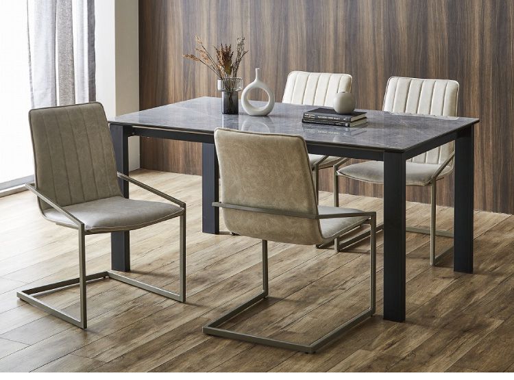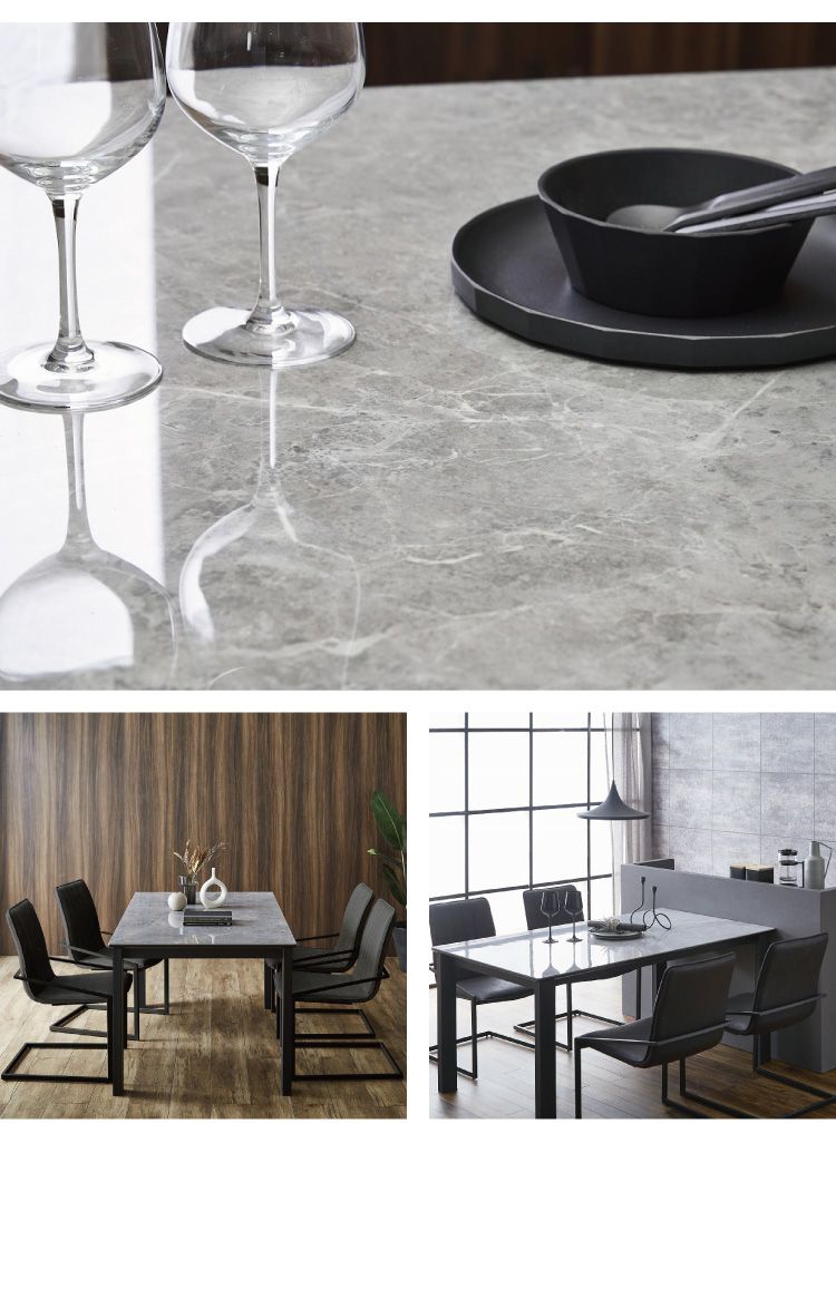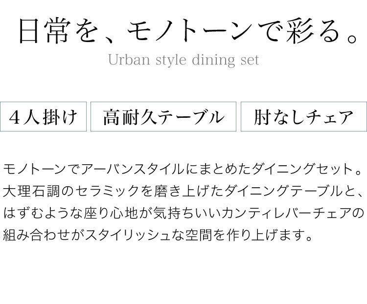 テーブルはデザイン性ある石目の鏡面セラミック天板採用。チェアは背中を包み込みふっくらした座り心地、流行のカンティレバーチェアでダイニングシーンを演出。