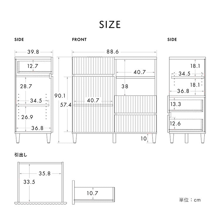 *商品サイズ:本体サイズ:W88.6×D39.8×H90.1(cm)、オープン部内寸:W40.7×D36.8×H38(cm)、引き出し内寸:W35.8×D33.5×H10.7(cm)、扉内内寸:W40.7×D36.8×H57.4(cm)、脚元空間:H10(cm)