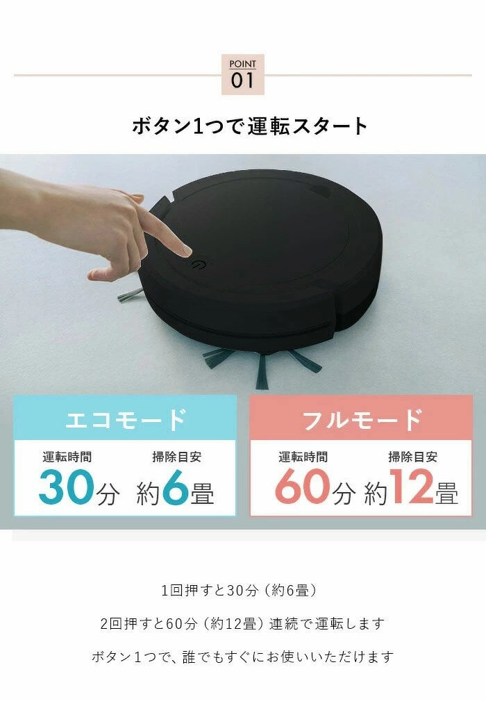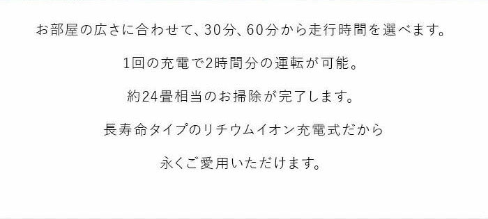 ■連続使用時間最大120分(満充電・電池初期/20℃時)※床の材質や室温などの使用環境により異なります
