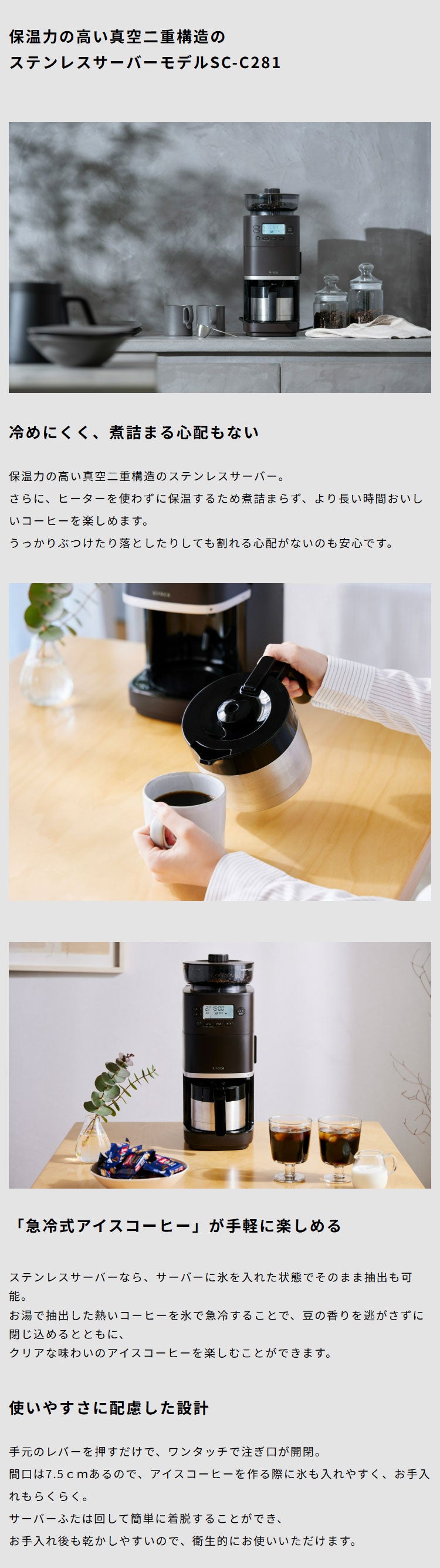 ・保温性にすぐれ、かつ、万が一落としも割れないステンレスサーバーを採用。
