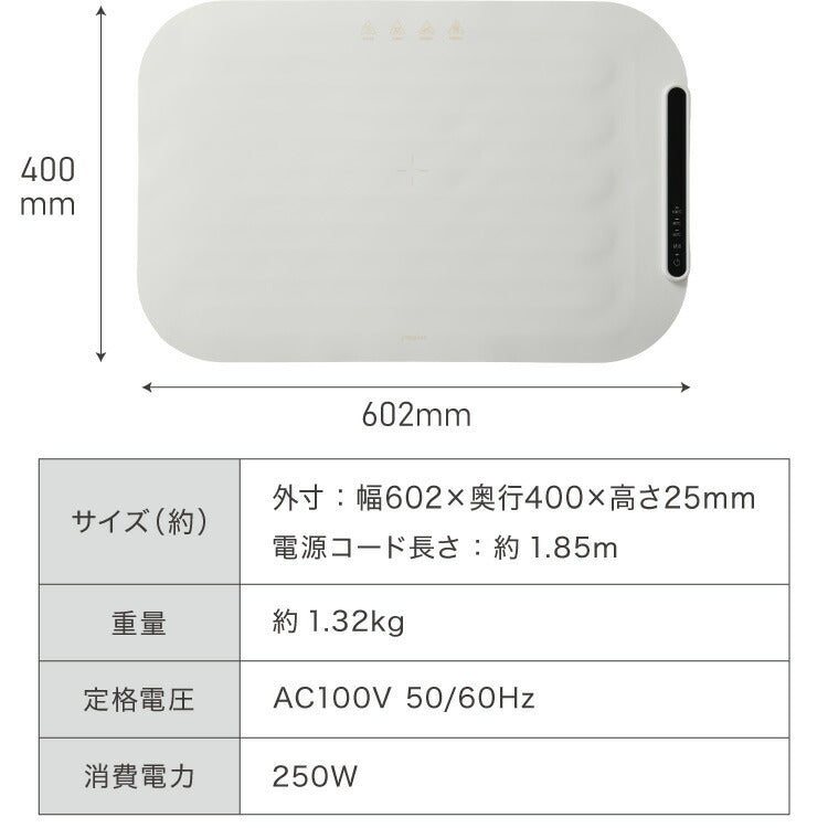 ・高速加熱&省エネ設計:電源ONから約10秒で加熱開始。消費電力250W、室温下で約13分で100℃に到達します。