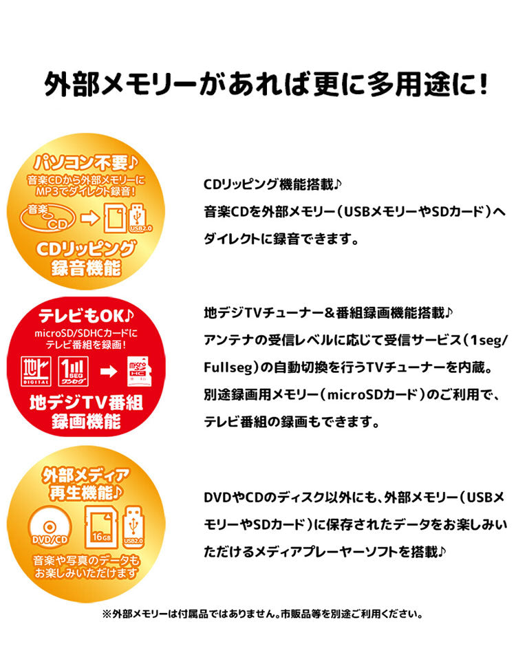 ※外部メモリーは付属品ではありません。市販品等を別途ご利用ください。