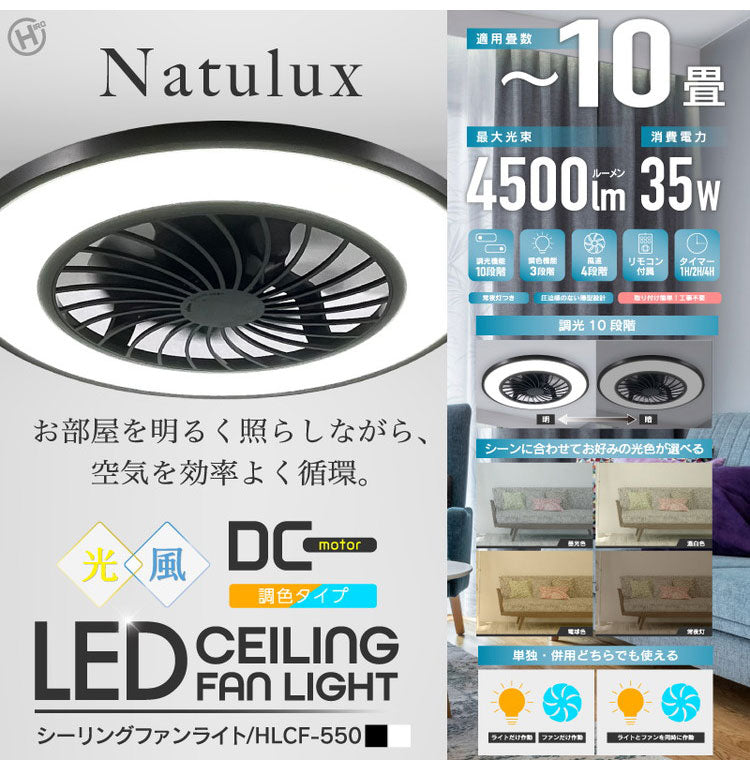 シーリングライト 10畳 シーリングファンライト ファン付 調光 10段階 調色 7段階 風速 4段階 オフタイマー 空気循環 換気 暖房 風の循環 取付簡単 ヒロコーポレーション HLCF-550