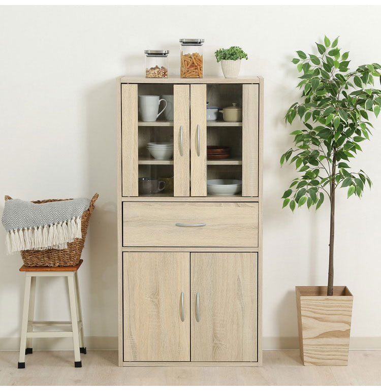 キッチンキャビネット 幅60cm ミドルサイズ ホワイトオーク 木目調 北欧 ガラス扉 食器棚 キッチン収納 大容量 引き出し 引き戸 おしゃれ シンプル キッチンボード 一人暮らし(代引不可)
