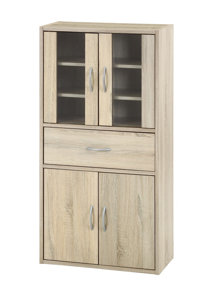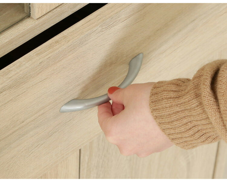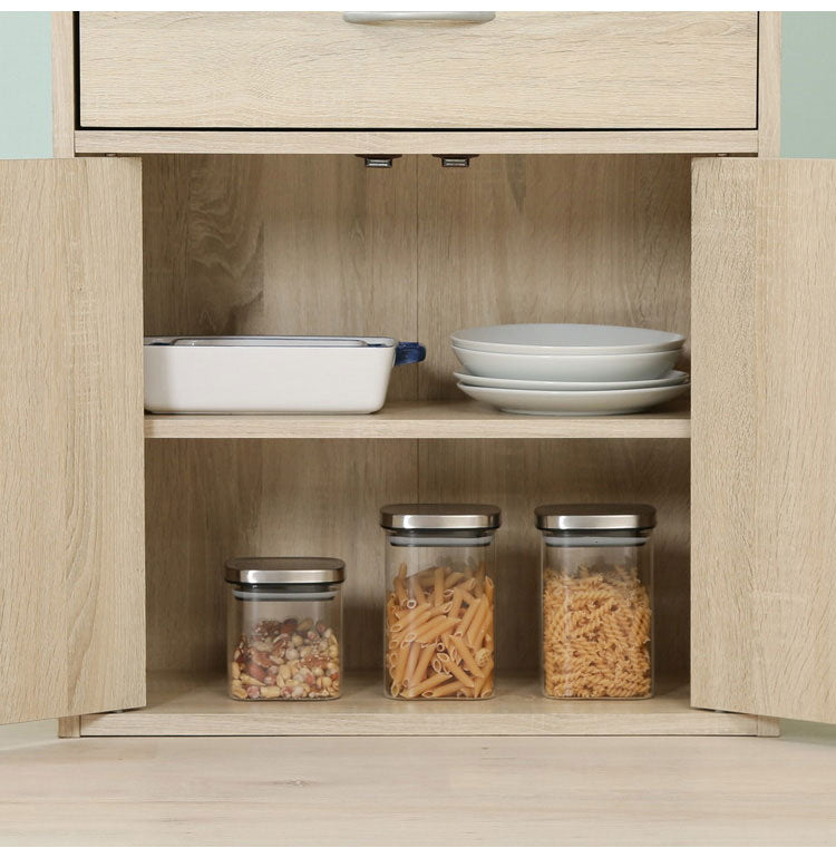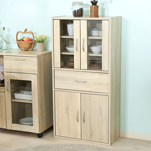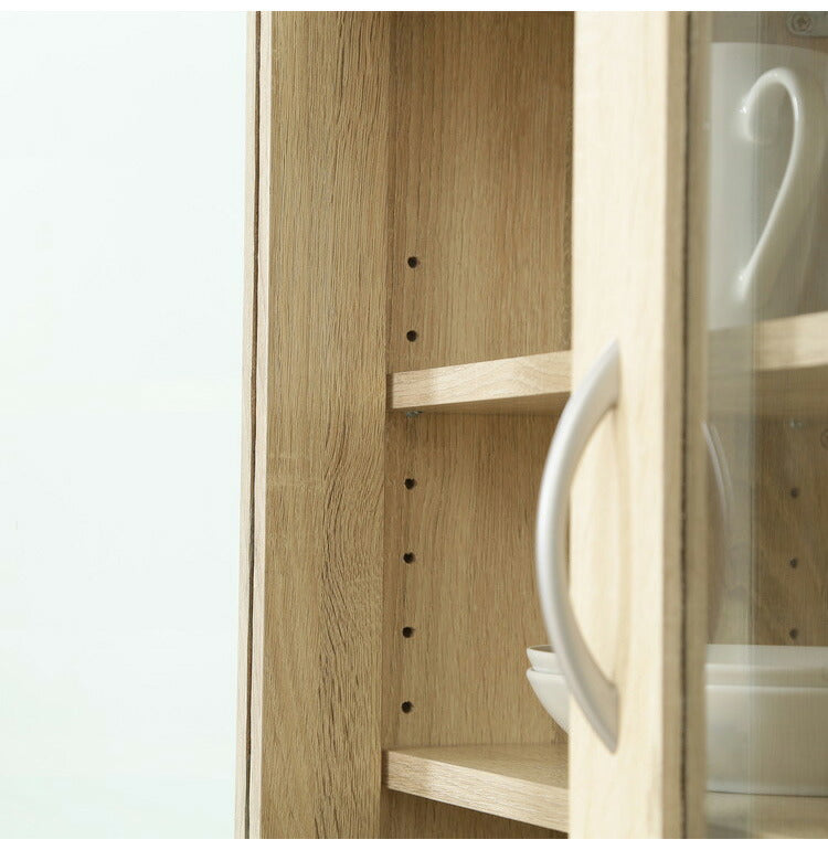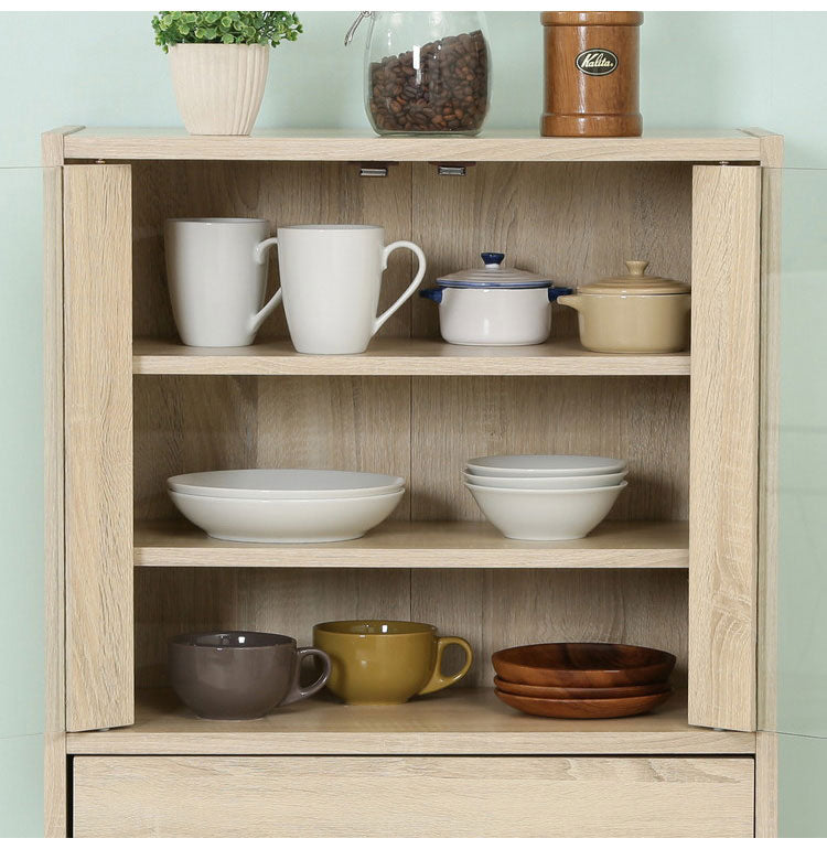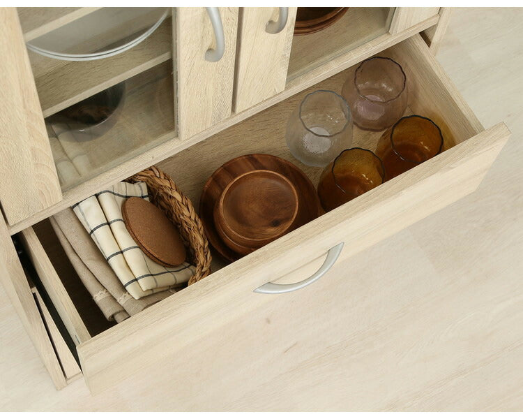 清潔感もあり他のインテリアにも馴染みやすいホワイトオーク色のキッチンボードです。上段の棚はガラス扉で、どこに何があるのかひと目で把握できます。また下段は大型の食器や缶詰、お菓子など隠しながらスッキリ収納できます。お箸やランチョンマットなどかさばる小物をすっきり収納できる引き出し付きです。