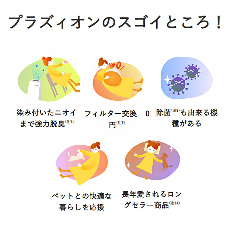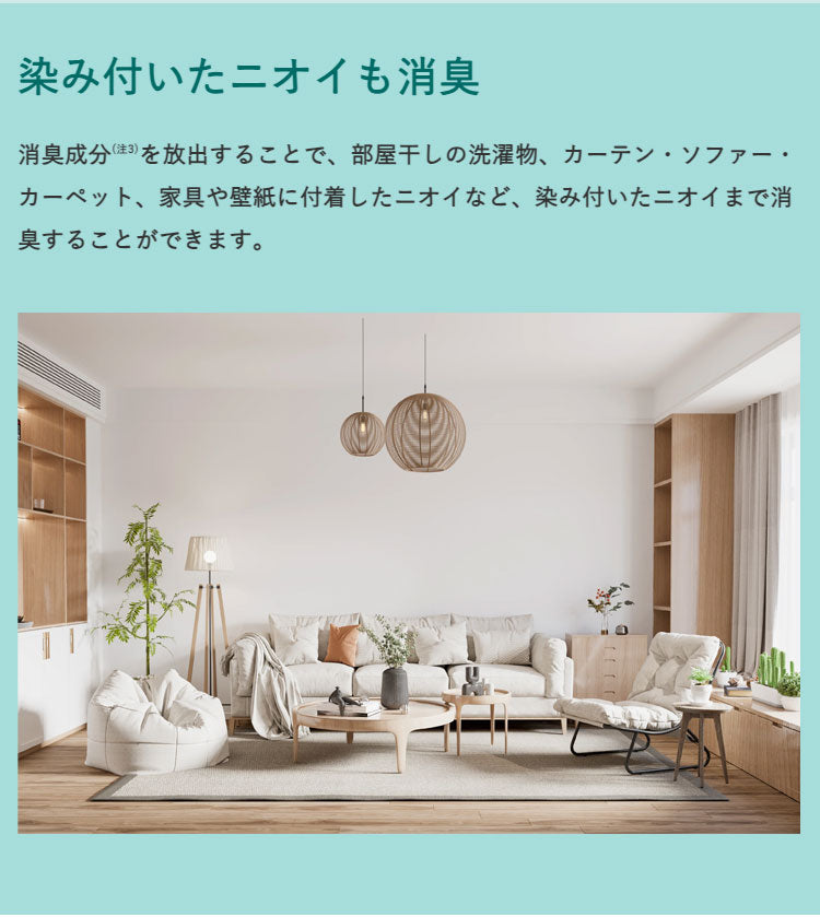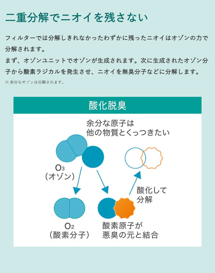 ■脱臭方式:高速メガフィルター(金属酸化触媒+ヒーターユニット) オゾンユニット(金属酸化触媒+オゾン)(金属酸化触媒ハニカムフィルター + オゾン) 消臭成分放出(低濃度オゾン)