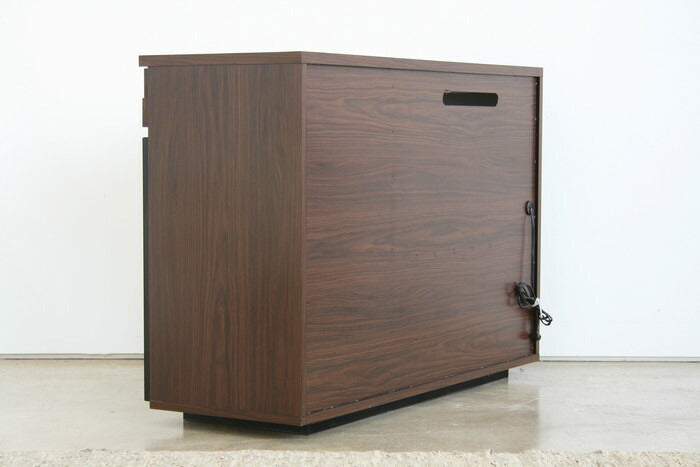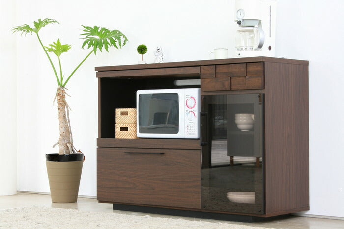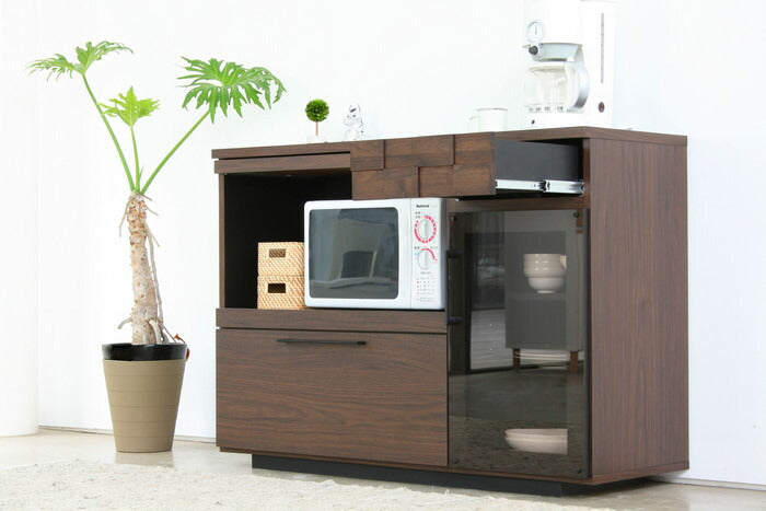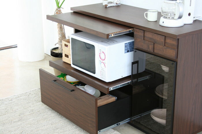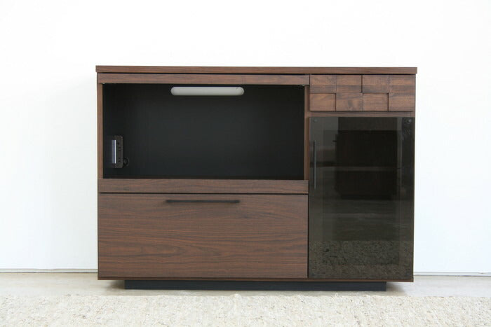 【サイズ】本体:W1196×D445×H850mm【素材】天板:強化紙、前面:アルダー無垢・オイル塗装、側:プリント、ガラス:4mm強化ダークグレーガラス【その他】天板耐荷重:15kg、棚板耐荷重:5kg、スライド棚耐荷重:5kg