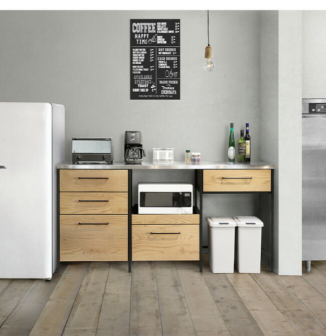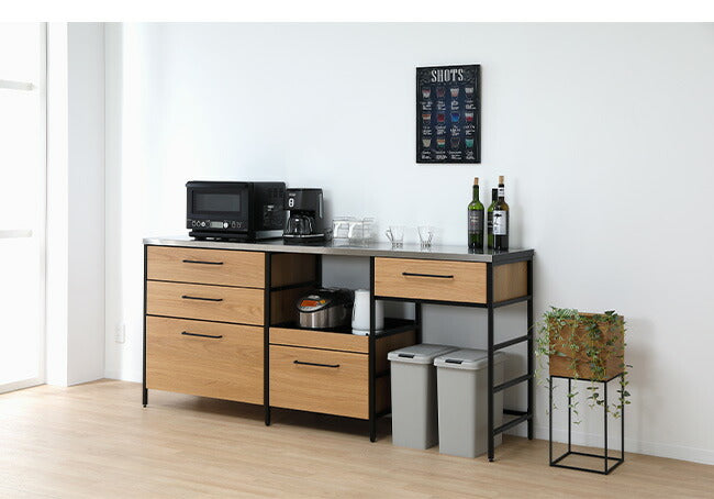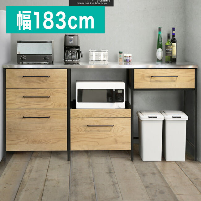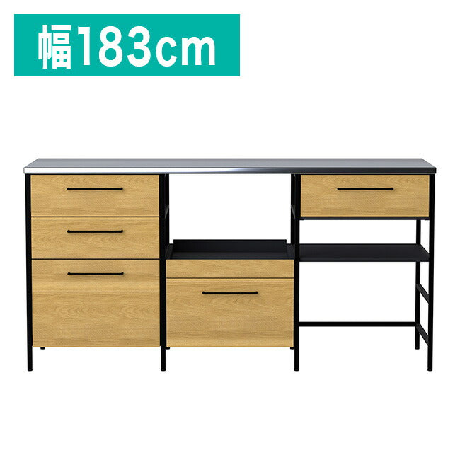 キッチンカウンター ステンレス天板 引き出し スライド棚 ダストカウンター 幅183 奥行48 高さ92 背面化粧 アイアンスチール オーク 天然木 フルオープンレール(代引不可)