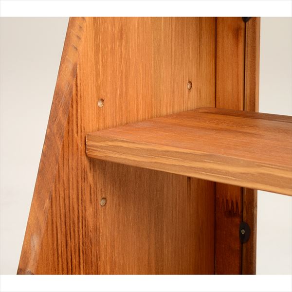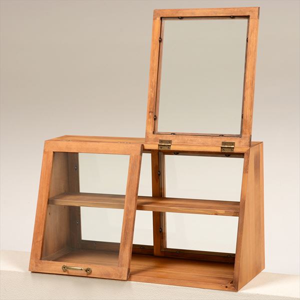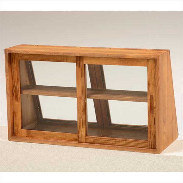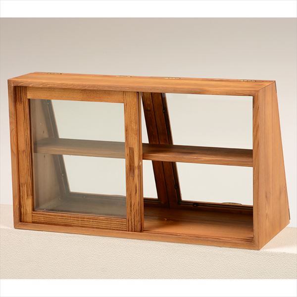 木の風合いが味わい深いカウンター上ガラスケース。表と裏で違う表情を見せる形状でディスプレイとしても活躍します。