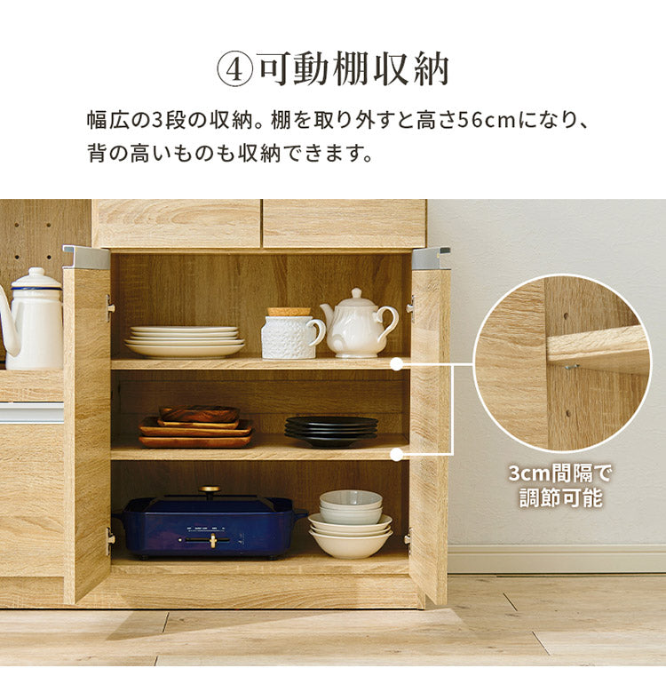 立って作業がしやすい天板高さのカウンターキャビネット。食器や調理器具、キッチン家電がスッキリ片付く大容量収納です。