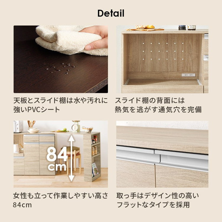 主材:プリント紙化粧パーティクルボード、天板・スライド棚:合成樹脂化粧パーティクルボード、取手:スチール