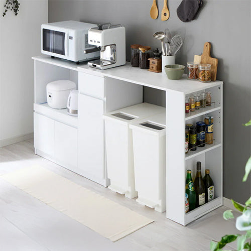 大理石調、モノトーン、白、ホワイト、キッチンカウンター、伸縮式、伸長式、食器棚、収納、ゴミ箱上ラック、ゴミ箱ラック、ごみ箱上ラック、ごみ箱ラック、キッチンラック