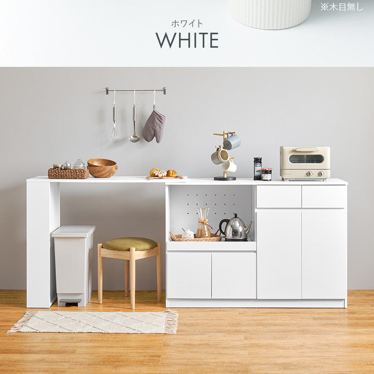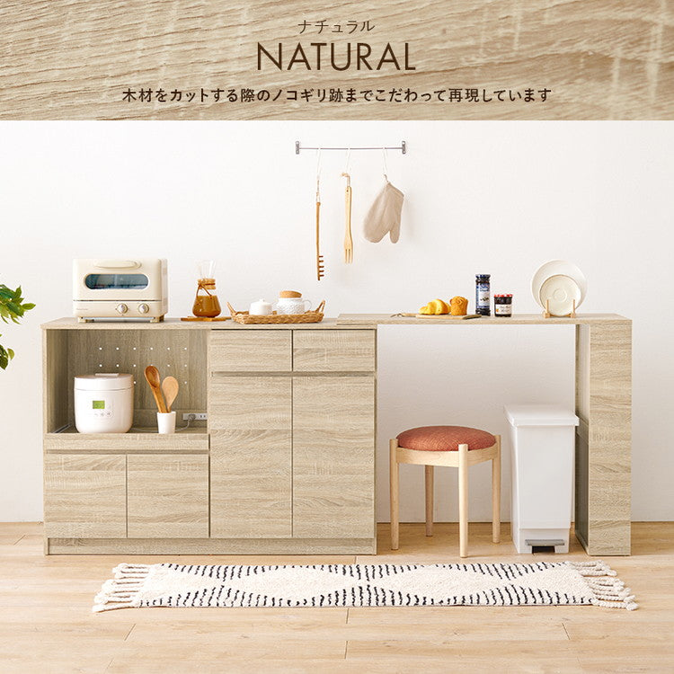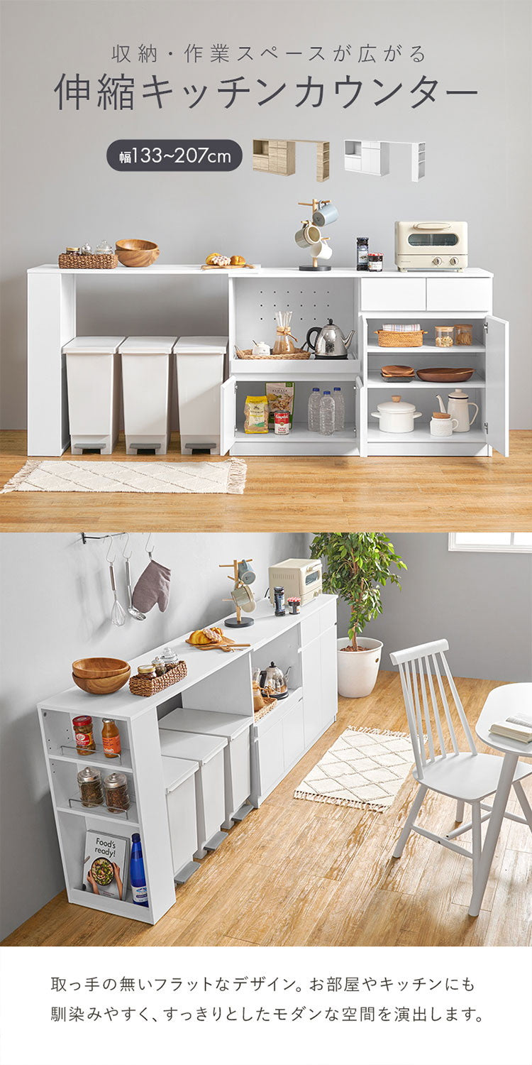 伸縮キッチンカウンター 2点セット 幅133~207 フラット 2口コンセント スライド棚 引出し 扉収納 キッチン収納 キャビネット 食器棚 レンジ台 レンジボード ごみ箱上ラック(代引不可)