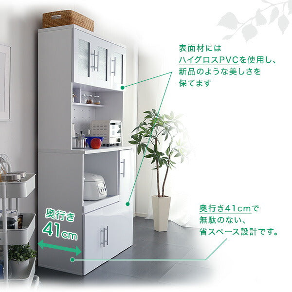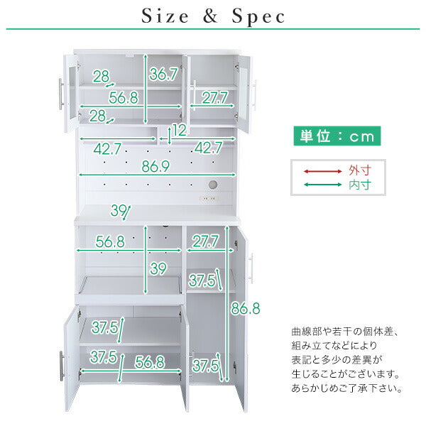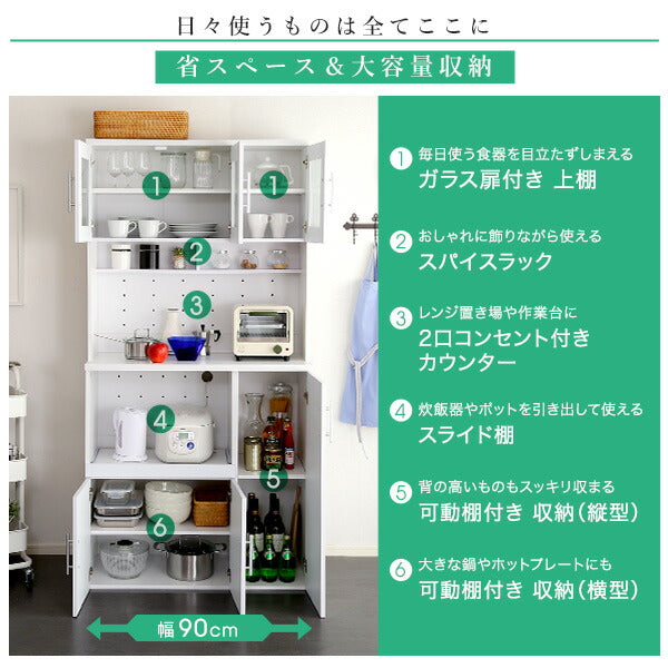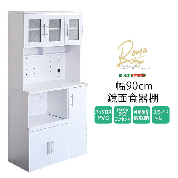 鏡面仕上げ 食器棚 幅90 白 ホワイト ハイタイプ 大容量 頑丈 アンティーク レンジ台 炊飯器 可動棚 収納 キッチンボード おしゃれ 北欧(代引不可)
