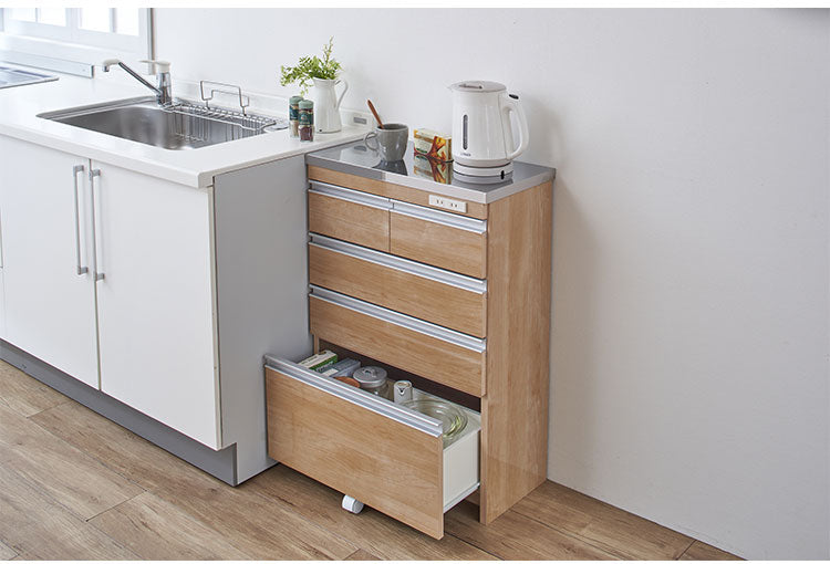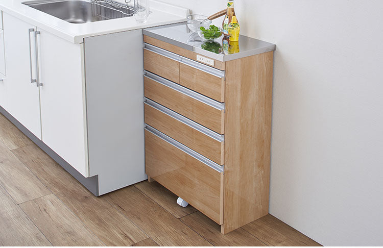 小引き出しは落下防止のストッパーが付き、最下段の引き出しには前倒れ防止のキャスターが付いて安心してご使用頂けます。