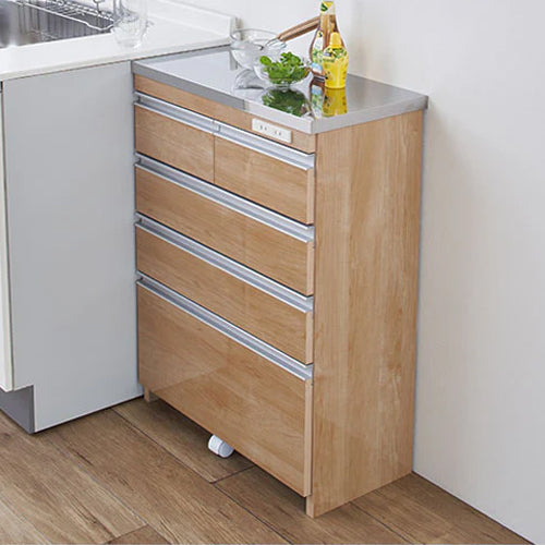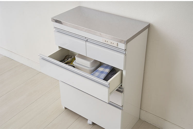 【完成品 日本製】キッチンカウンター ステンレス鏡面薄型 幅60 高さ85 奥行30 4段 背面化粧仕上げ 鏡面仕上げ 間仕切り オープンスライド 完成品 国産 テーブル 食器棚 キッチンボード 引き出し(代引不可)
