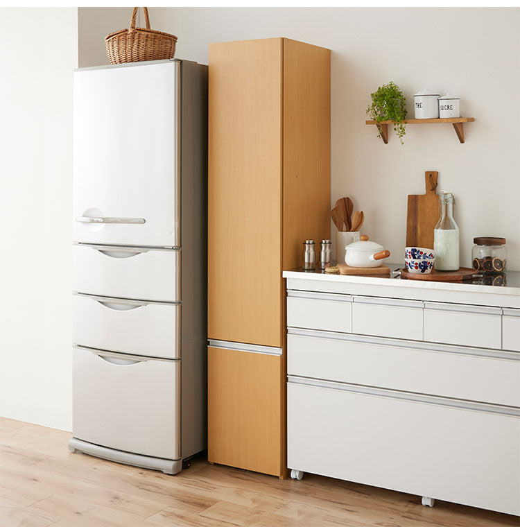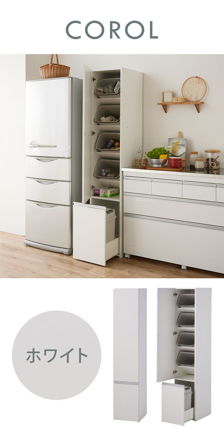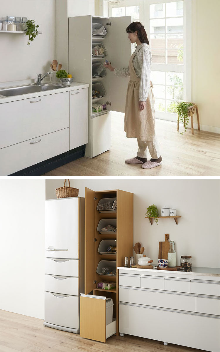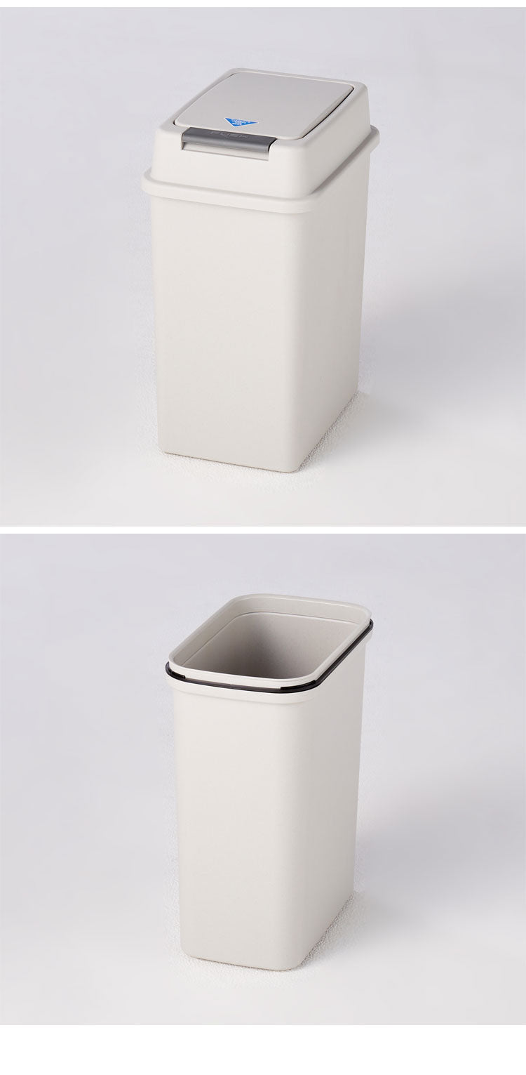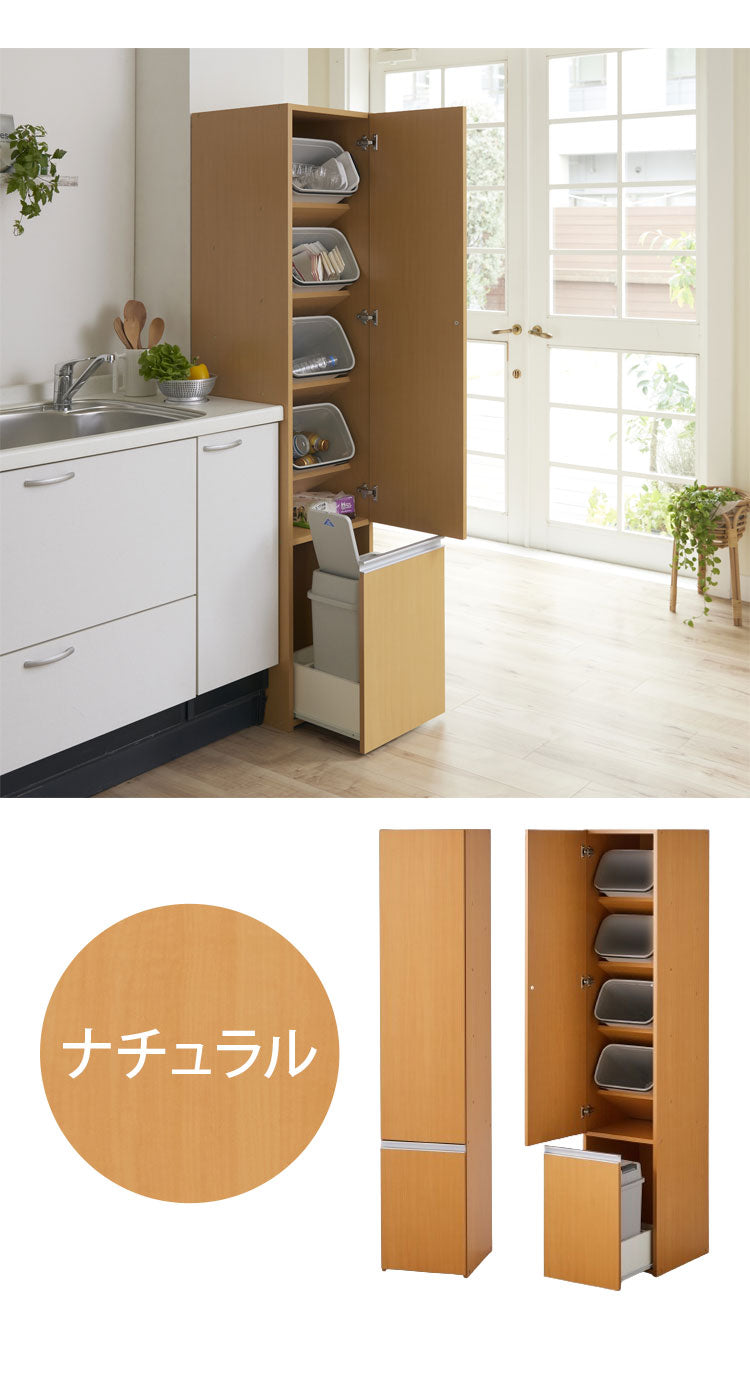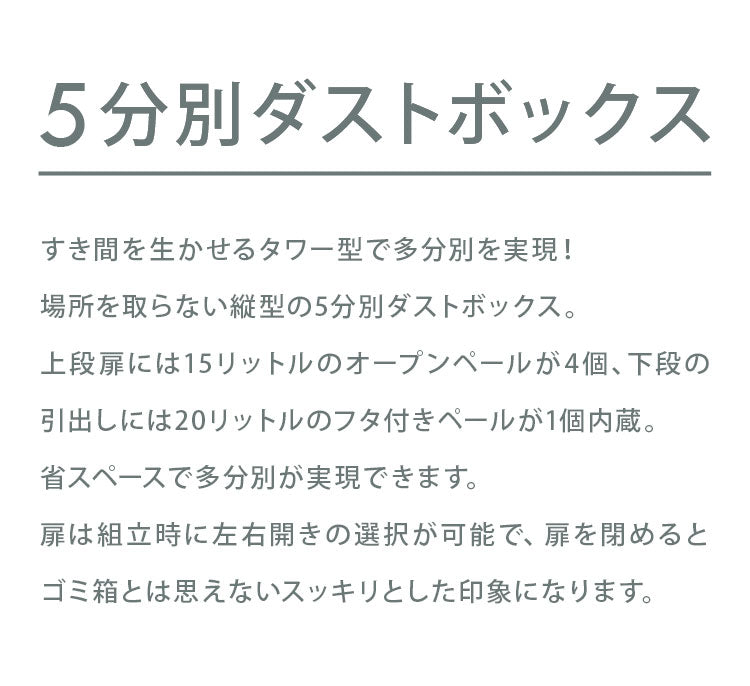 上段扉には15リットルのオープンペールが4個、下段の引出しには20リットルのフタ付きペールが1個内蔵。省スペースで多分別が実現できます。扉は組立時に左右開きの選択が可能で、扉を閉めるとゴミ箱とは思えないスッキリとした印象になります。