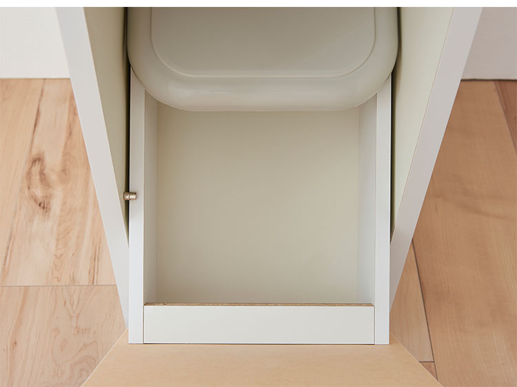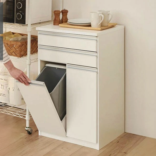 フラップ扉を開けると中のフタが自動で開くこだわりのダストボックス。ペールのフタを開閉する手間が省けます。上段には引出し2杯付きでゴミ袋のストックや小物の収納が可能。スライドレール付きで開閉もスムーズです。天板は汚れてもサッと拭き取れる素材です。メープル柄のナチュラルとホワイトの組合せがおしゃれでどんなシーンにもマッチします。見た目ではゴミ箱とはわかならいスマートな家具調のダストボックスです。