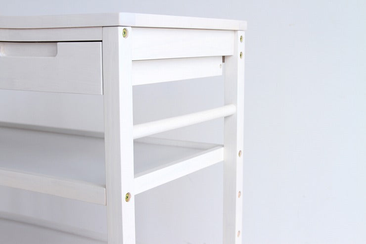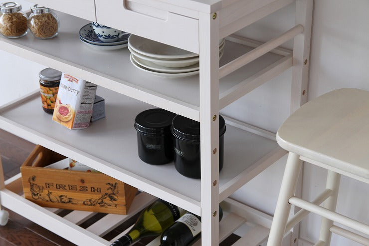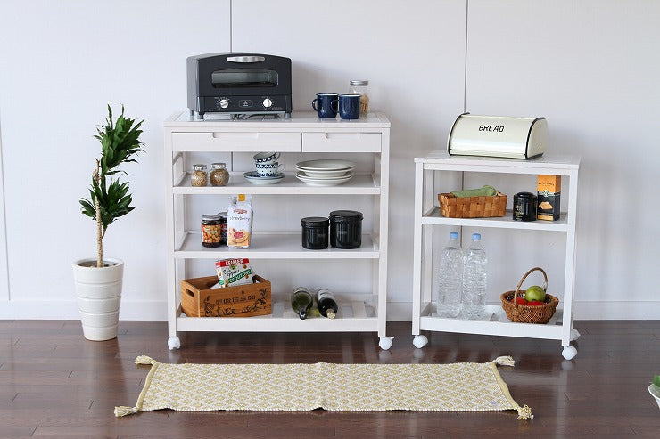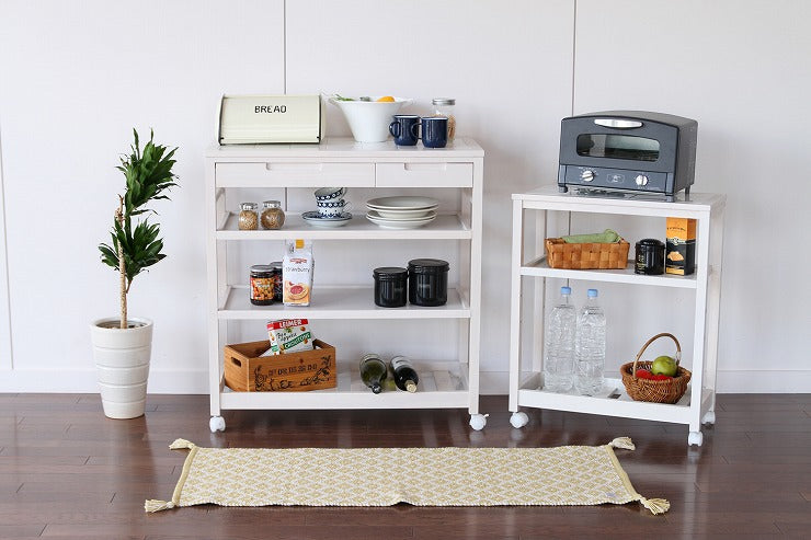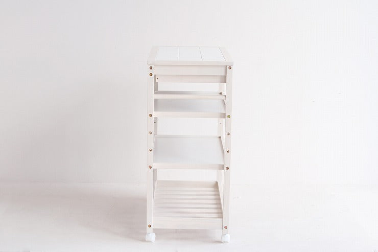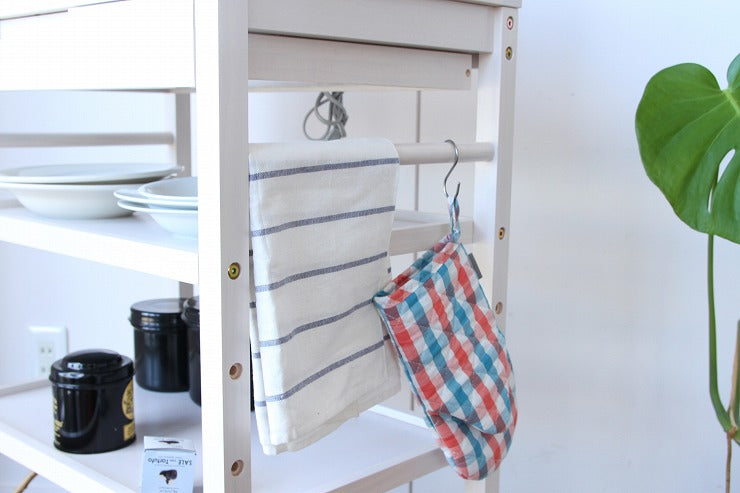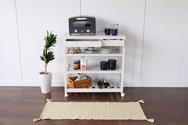 熱いお鍋などが置けるタイルトップ、キッチン用品が収納できる引き出し、上下高さ調節可能な棚板、タオルもかけられる丸棒のサン、収納力と機能性いっぱいのワゴンです。