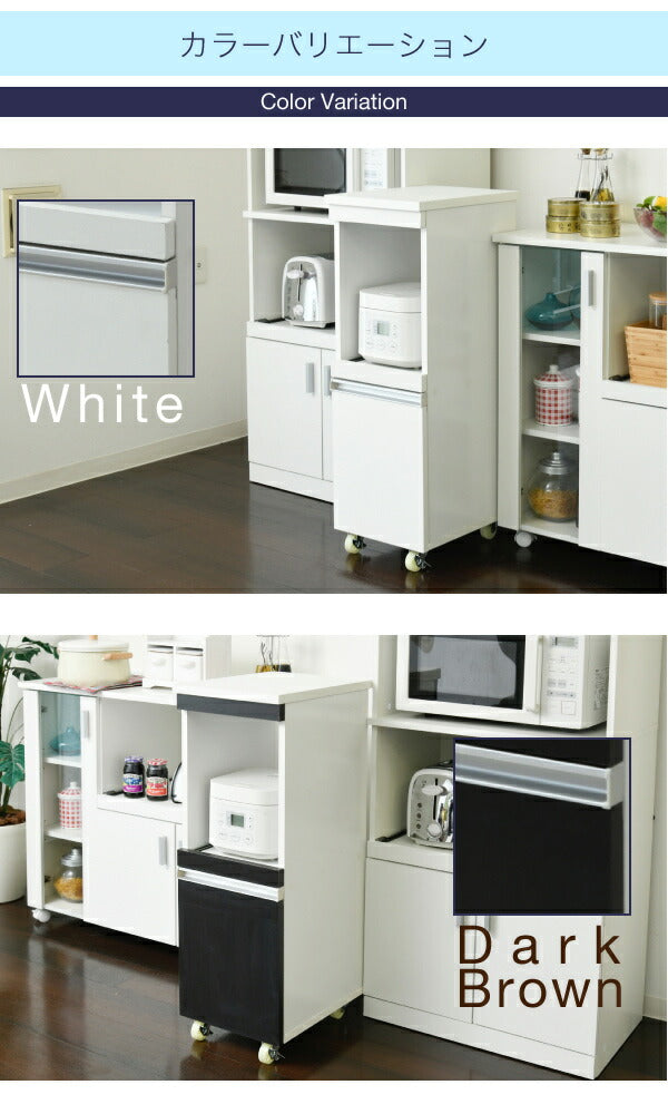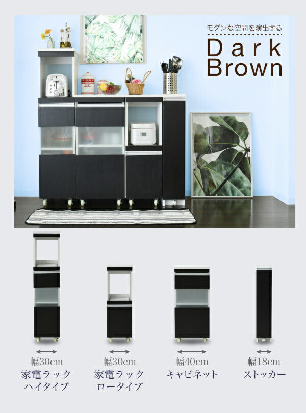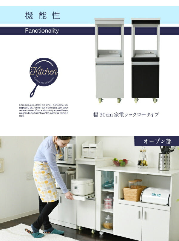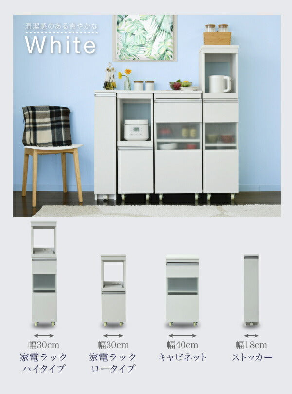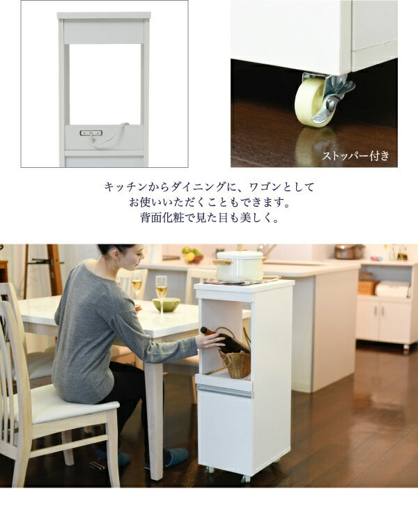 家電の収納に便利なコンセント付きスライド棚と、収納物に合わせて高さ調節ができる可動棚付きの食器棚をこれ1台で。ロータイプは天板も使いやすいちょうど良い高さ。キッチンのちょっとした隙間に設置すれば、それまでのデッドスペースを有効活用できます。