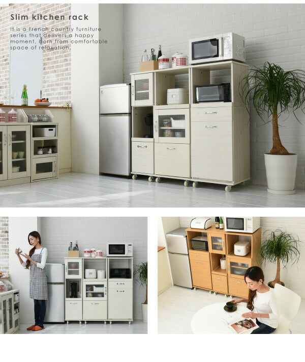 木目調とガラスのカントリーテイストが可愛いリュッカランドのキッチンシリーズ。コンパクトながらも豊富な収納スペースで、レンジや家電も効率よくまとめられます。