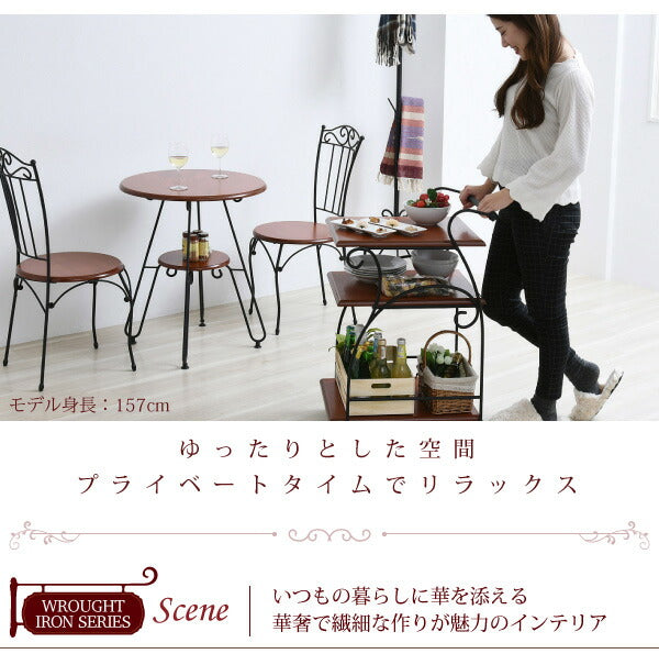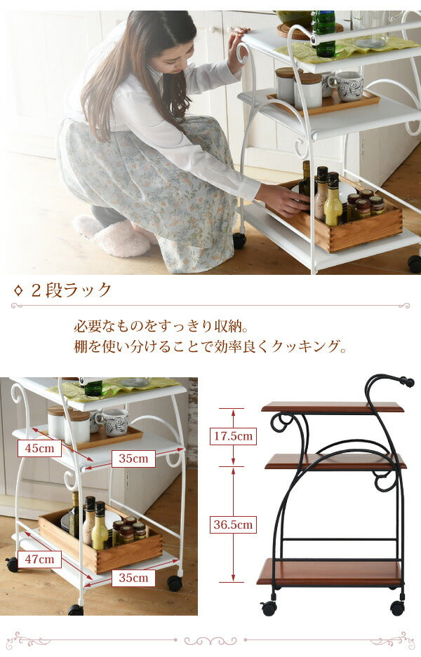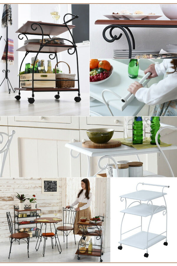 ダイニングテーブルと揃えてヨーロピアンなお部屋を作る女性らしいアイテム。キャスターにはロックが付いているので、お料理を運ぶとき以外でもキッチンラックとしてご使用いただけます。