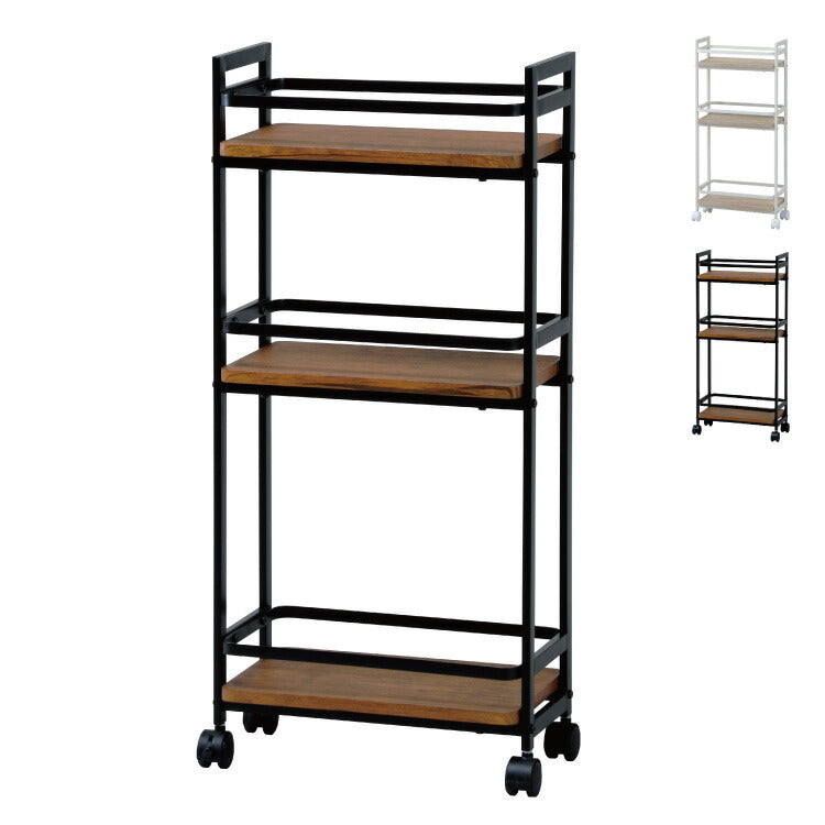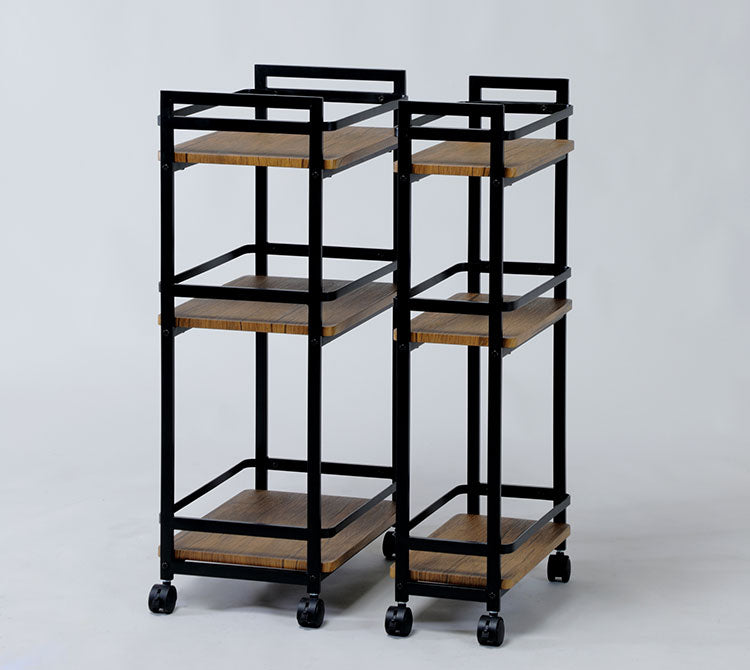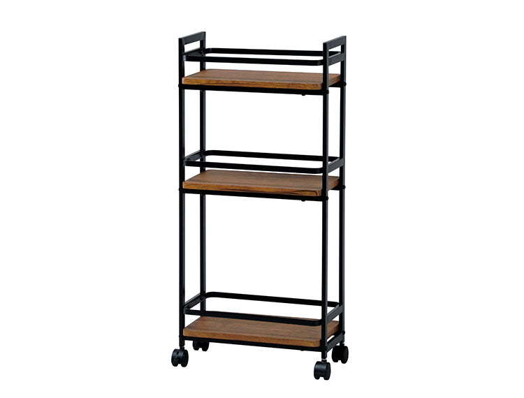 細めのスチールと木目調の棚板が特徴のトローリーワゴン。