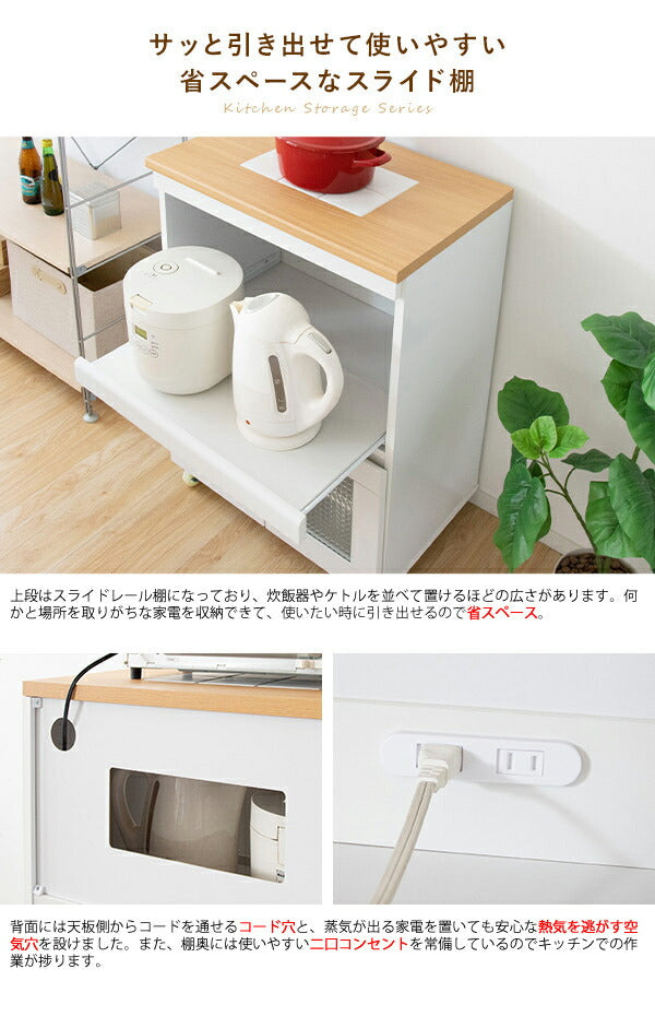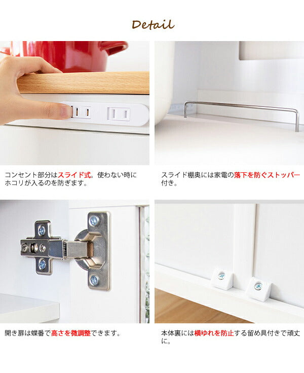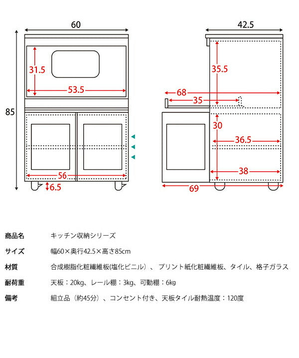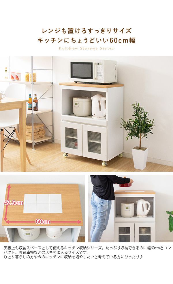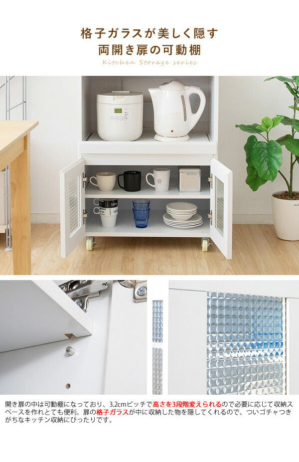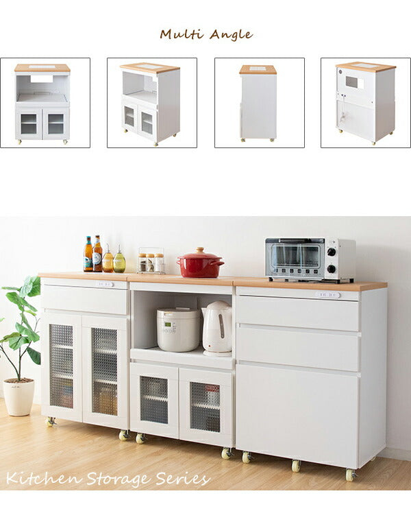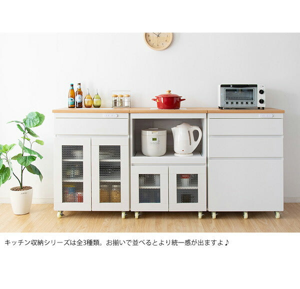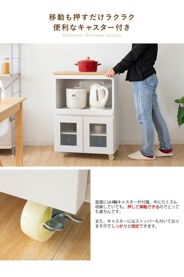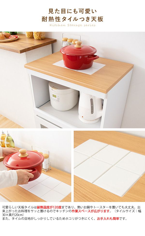 天板上にはタイルが敷かれており、熱いお鍋やトースターを置くことができとても便利。スライド棚やガラスが美しい開き扉もあり、たっぷり収納できます。キャスター付きでお掃除の時の移動も楽々。