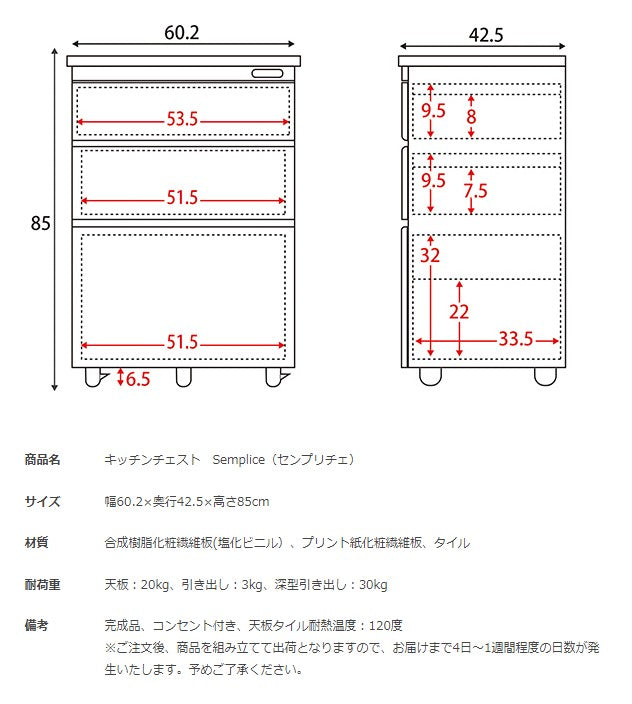 天板:20kg、引き出し:3kg、深型引き出し:30kg
