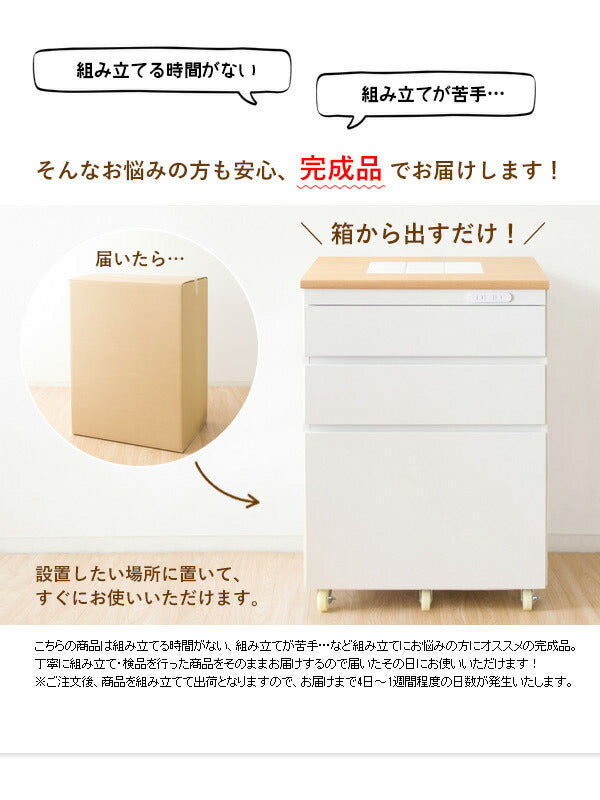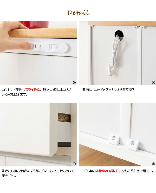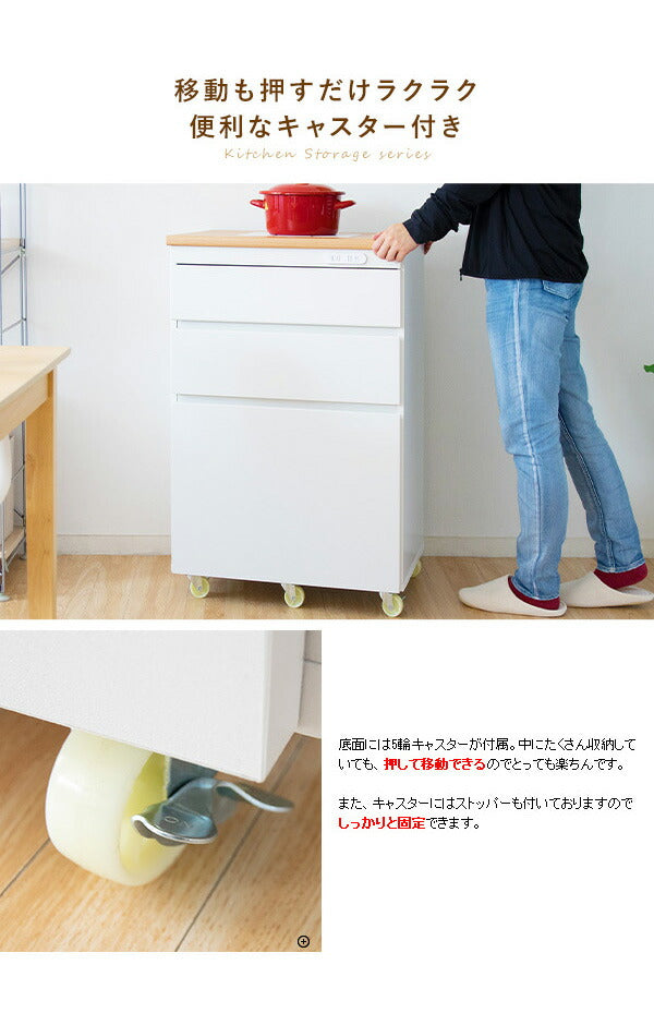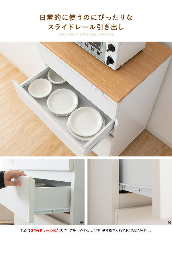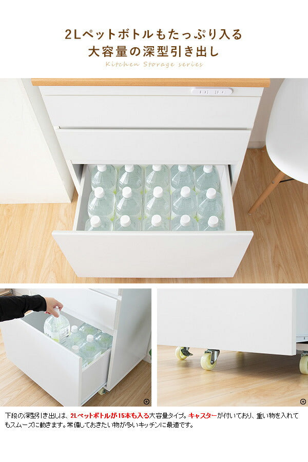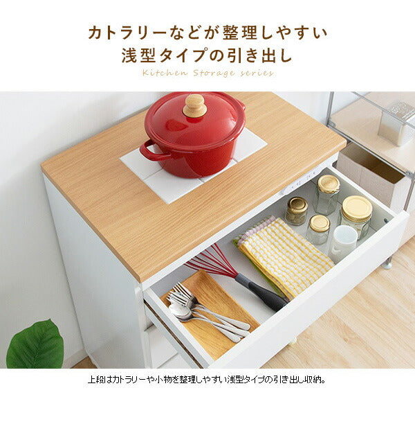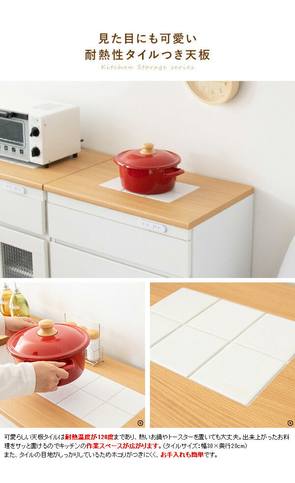 天板上にはタイルが敷かれており、熱いお鍋やトースターを置くことができとても便利。2段の整理しやすい浅型引き出しと、2Lペットボトルも入る深型引き出しにたっぷり収納できます。キャスター付きでお掃除の時の移動も楽々。