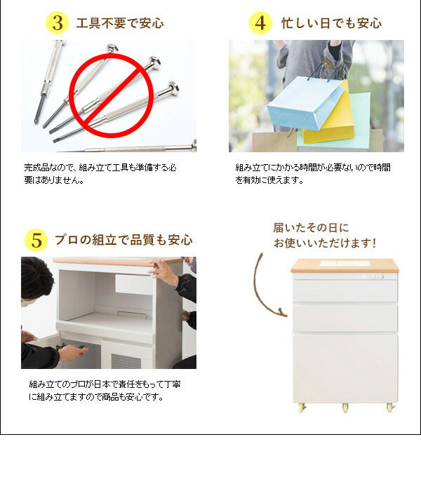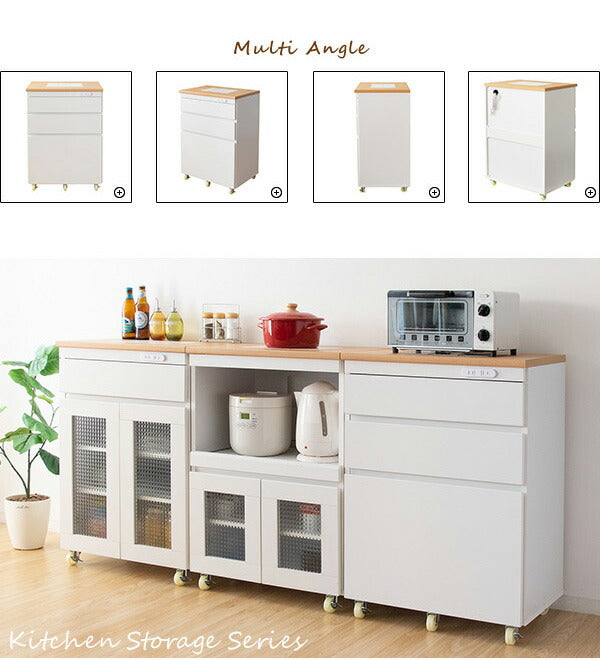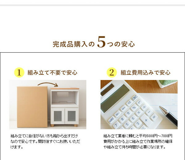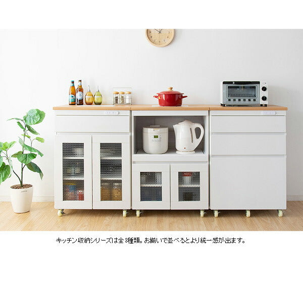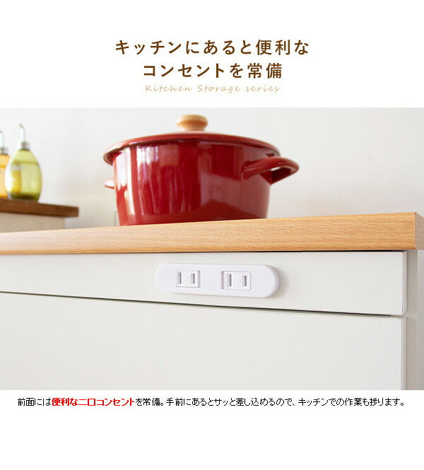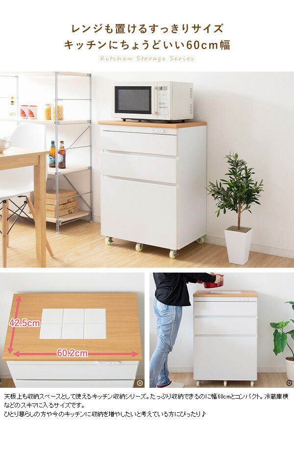 ホワイト×ナチュラルの見た目が可愛らしいキッチン収納シリーズ「Semplice(センプリチェ)」。幅60cmとコンパクトなサイズながら、電子レンジも置ける大容量収納が魅力です。