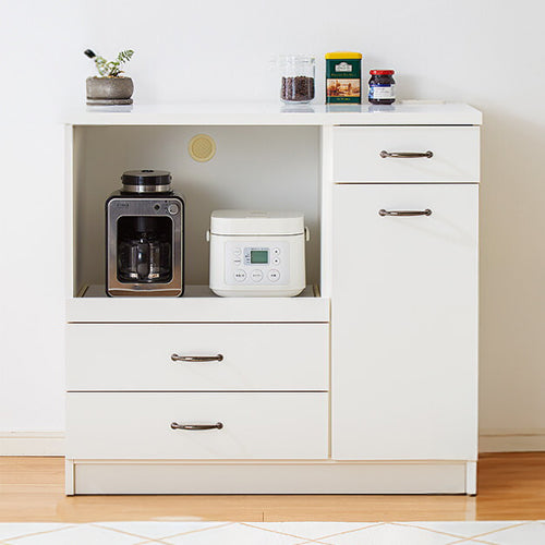 日本製 キッチンカウンター 90 完成品 スライドレール ゴミ箱付き 引き出し収納×3 間仕切り 幅88.5×奥行44.5×高さ82cm フルオープン ホワイト シルバー 2色 国産(代引不可)