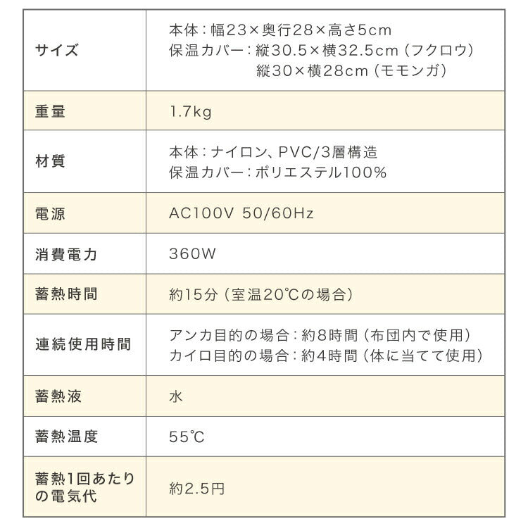 (本体)幅23x奥行28x高さ5cm、(保温カバー)縦30.5x横32.5cm(FK)、縦30x横28cm(MM)