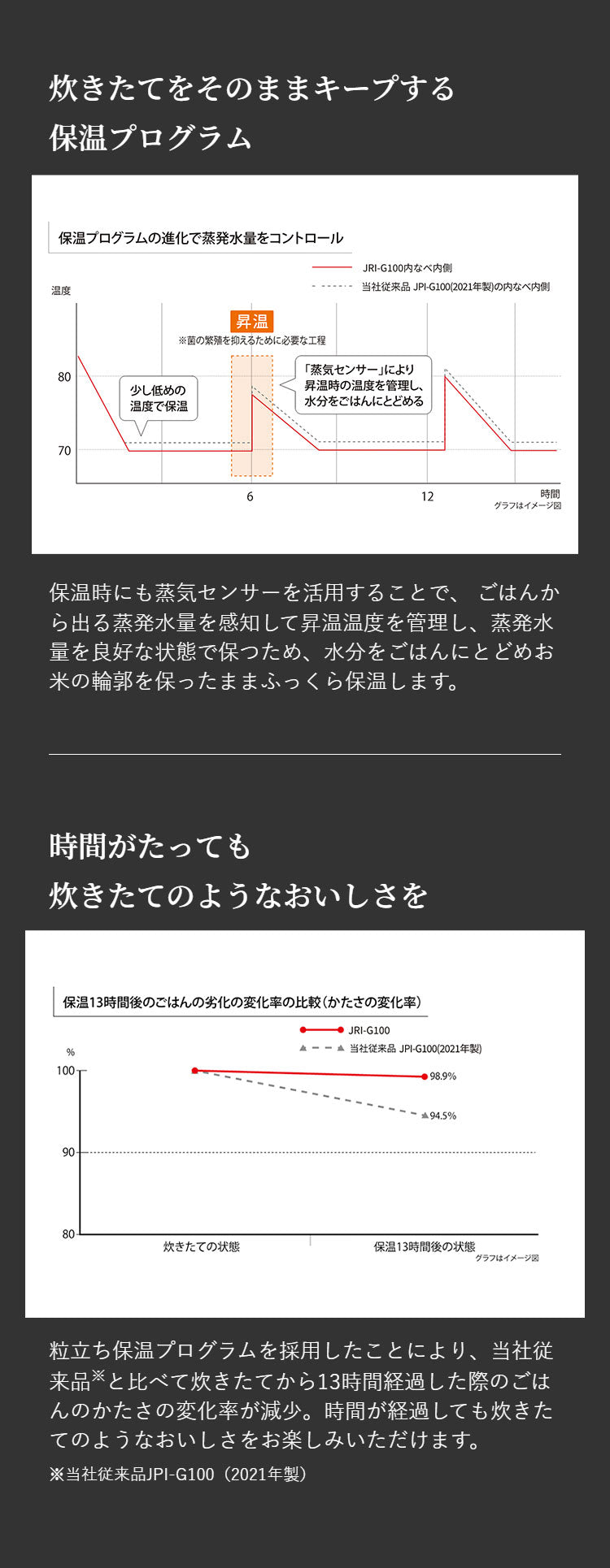 炊きたてのおいしさそのまま保温。保温時にも蒸気センサーを活用することで、ごはんから出る蒸発水量を感知して昇温温度を管理し、蒸発水量を良好な状態で保つため、水分をごはんにとどめお米の輪郭を保ったままふっくら保温します。炊きたてのようなおいしさをそのままふっくら保温。お米の水分を保ち、パサつきにくく、みずみずしいごはんへ。