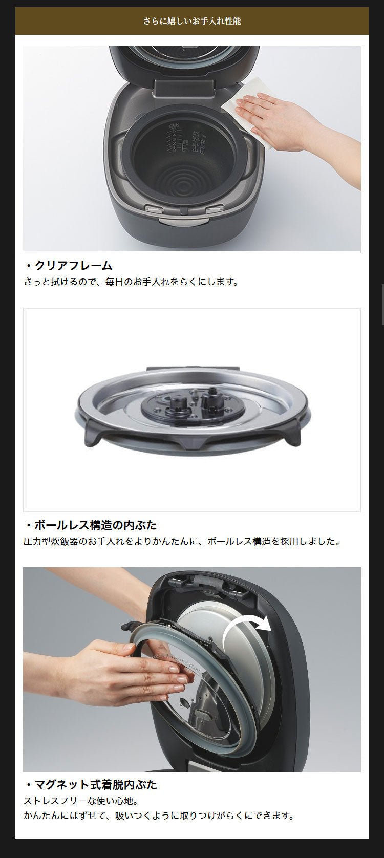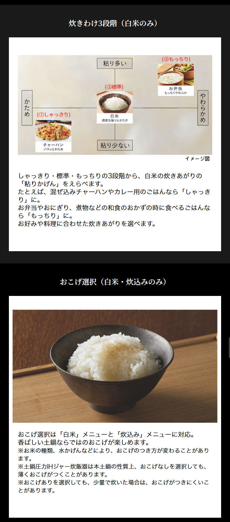 ※土鍋圧力IHジャー炊飯器は本土鍋の性質上、おこげなしを選択しても、薄くおこげがつくことがあります。