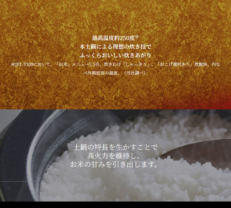※JPL-Y100において、「白米」メニュー5.5合、炊きわけ「しゃっきり」、「おこげ選択あり」炊飯時。内なべ外側底面の温度。(メーカー調べ)