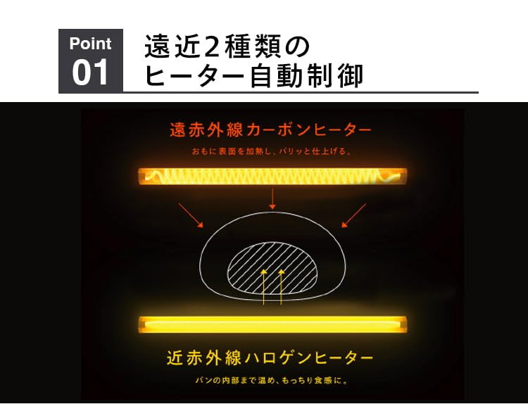 遠赤外線・近赤外線2種類のヒーターがパンの外側と内部それぞれにアプローチすることで、匠が認めた「魔法の温度バランス」に仕上げます。