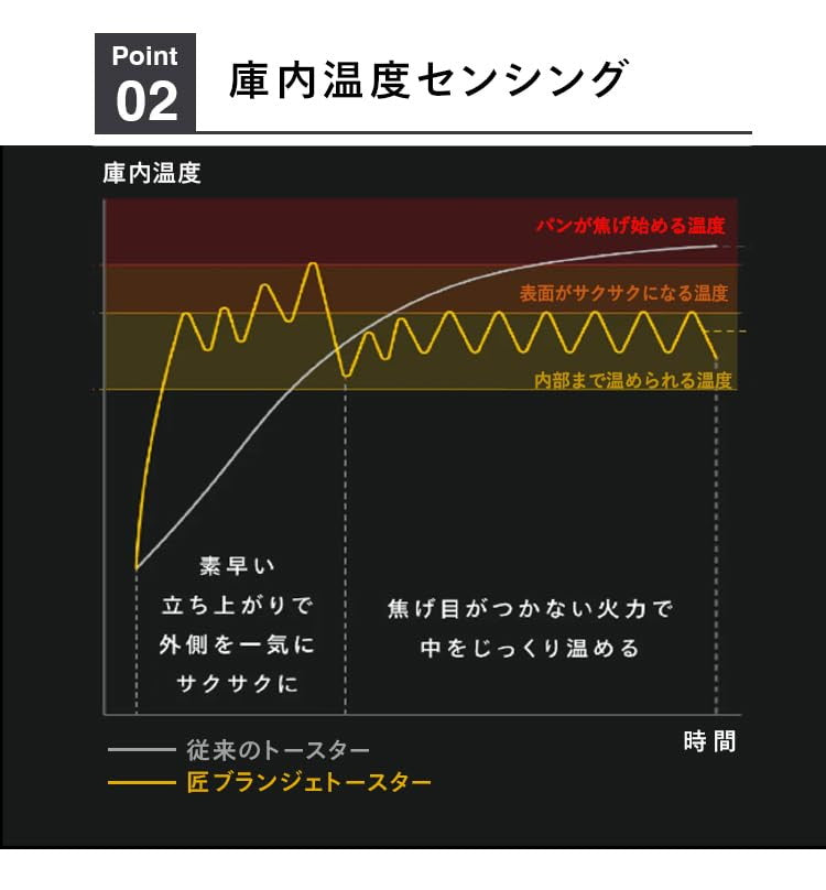 匠が認めた魔法の温度バランスを作り出すために、センサーが秒単位で温度を計測。パンを含む庫内の状態を見極め続けます。