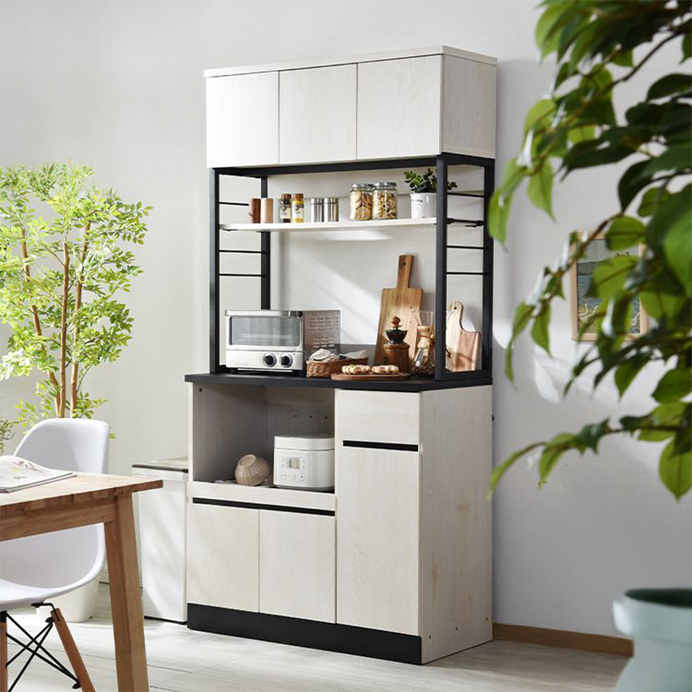 ウッドとスチールの食器棚 幅90cm 大型レンジ対応 キッチンボード キッチンキャビネット レンジ台 キッチン収納 スチールラック(代引不可)