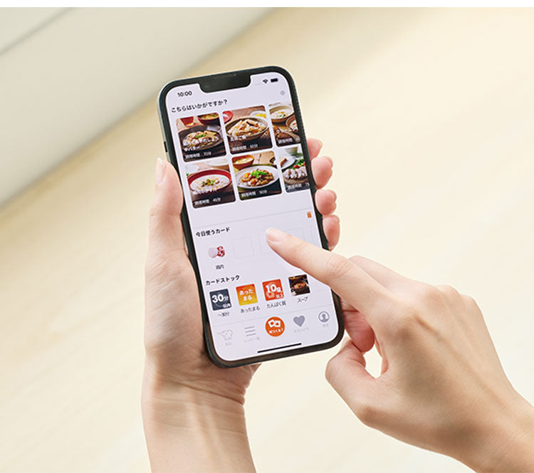3.今の気分にぴったりなレシピ提案を。本体と連携し、献立決めをサポートする「象印アプリ」対応。「食材」・「料理」・「栄養素」・「気分」・「調理時間」の項目に応えると、多数あるレシピの中からあなたにぴったりの料理を提案します。また、調味料を入れるタイミングをお知らせしてくれる「調味料追加の通知機能」も搭載